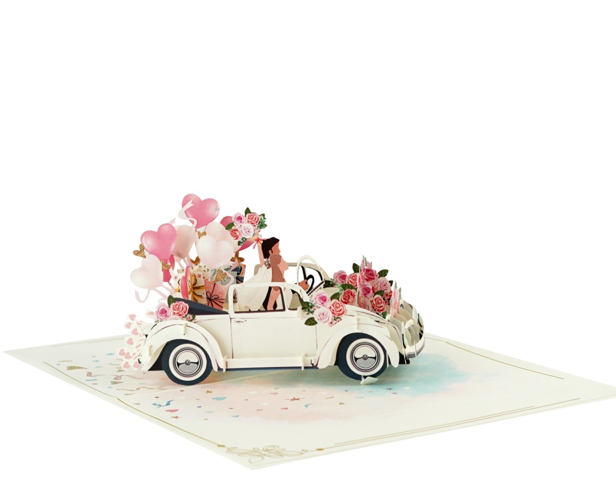 Tạo bất ngờ cho ngày trọng đại với thiệp 3D Pop Up xe cưới Just Married. Khi mở ra, chiếc xe cưới màu đỏ nổi bật bật lên đầy sống động, trang trí hoa tươi