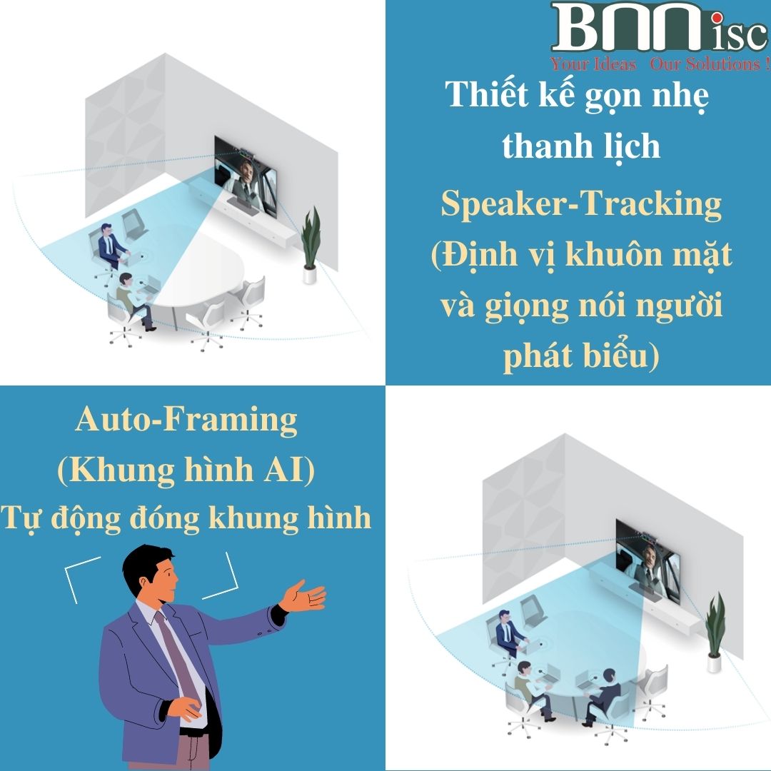 - Góc quay 120° , Lên/Xuống 15° , Tự động cân bằng sáng, giảm nhiễu, Tự động điều chỉnh bắt hình tất cả những People tham gia họp (Auto-Framing), Tự động bắt theo tiếng phát biểu.