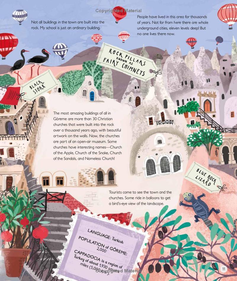 The guides are children who tell us about the animals, plants and weather that they encounter; the feasts and festivals they enjoy; and the clothes they wear, the way they learn, the languages they speak, and the sports and games they play. The tour is truly global, as we journey from Australia’s desolate Red Centre to bustling Beijing, from the windswept Outer Hebrides to the rock houses of Cappadocia in Turkey, via the Amazon rainforest, New York City, the Siberian tundra, and a floating village in Cambodia.