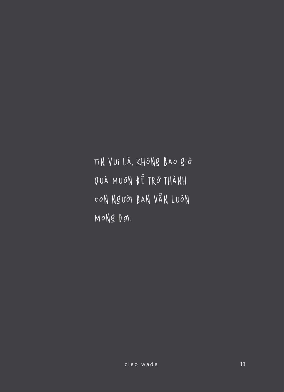 Cleo Wade là tác giả và nhà thơ bán chạy hàng đầu của New York Times với các tác phẩm theo đuổi chủ đề khám phá niềm hy vọng, sự kiên cường và sức mạnh của tình yêu. Các tựa sách của cô bao gồm “Heart Talk”, “Where to Begin”, “What the Road Said”, “Remember Love: Words for Tender Times” và “May You Love and Be Loved”. Cleo đến từ New Orleans, Louisiana và hiện đang sống tại California cùng với người bạn đời của m.ình, Simon và hai cô con gái của họ, Memphis và Bayou.