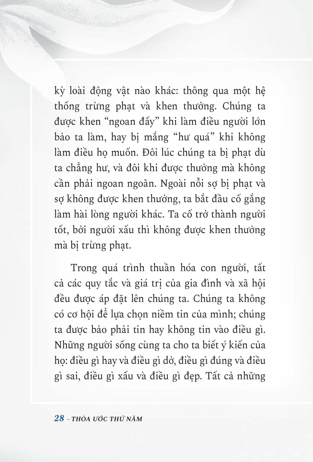 Trong Thỏa ước thứ năm, don Miguel Ruiz tham gia cùng con trai của m.ình, don Jose Ruiz, đưa ra một cái nhìn mới mẻ về Bốn thỏa ước, và một thỏa ước mới mạnh mẽ hơn để biến cuộc sống của chúng ta thành thiên đường riêng của chúng ta. Thỏa ước thứ năm đưa chúng ta đến mức độ nhận thức sâu hơn về sức mạnh của bản thân, và đưa chúng ta trở lại tính chân thật mà chúng ta được sinh ra. Cuốn sách đã thay đổi cuộc đời của hàng triệu người trên thế giới, chúng ta được nhắc nhở về món quà lớn nhất mà chúng ta có thể ban tặng cho bản thân: tự do trở thành con người thật của chính m.ình.