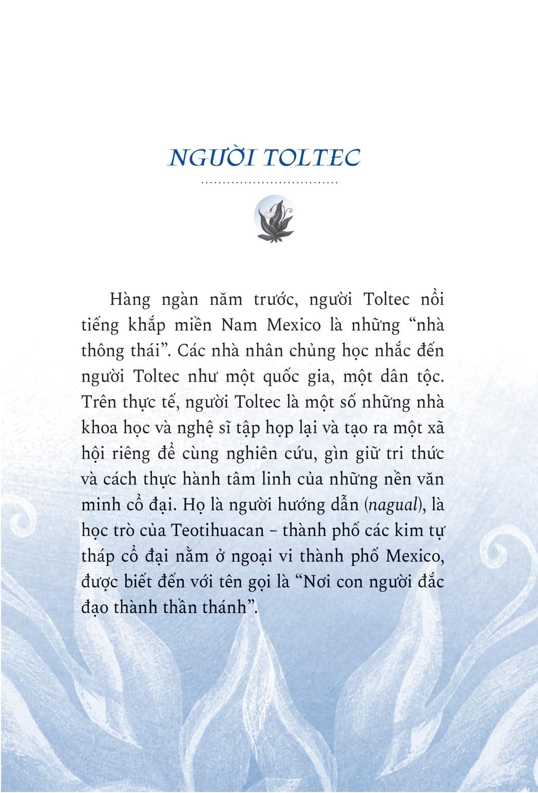 May thay, tri thức bí truyền này của người Toltec vẫn được truyền từ đời này sang đời khác trong gia tộc của các nagual. Và dù đã được giữ bí mật hàng trăm năm, những lời tiên tri cổ xưa đã dự đoán rằng những lời dạy thông thái này rồi sẽ được mở ra cho người dân. Và giờ đây, Miguel Ruiz, một vị nagual của dòng tộc Hiệp sĩ Đại Bàng, đã được Bề Trên lựa chọn để chia sẻ cho đại chúng những lời dạy đầy quyền năng này của người Toltec.