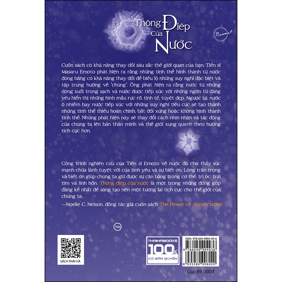 “Thông điệp của nước” có khả năng thay đổi một cách sâu sắc thế giới quan của bạn. Tiến sĩ Masaru Emoto phát hiện rằng những tinh thể hình thành từ nước đóng băng có khả năng thay đổi để biểu lộ những suy nghĩ đặc biệt và tập trung hướng về ‘chúng’. Ông phát hiện ra rằng nước từ những dòng suối trong sạch và nước được tiếp xúc với những ngôn từ đáng yêu hiển thị những hình mẫu rực rỡ, phức tạp và dạng bông tuyết đầy sắc màu. Ngược lại, nước ô nhiễm, hay nước tiếp xúc với những suy nghĩ tiêu cực, hình thành những hình mẫu thiếu hoàn chỉnh, bất đối xứng có màu sắc mờ tối. Ý nghĩa của nghiên cứu này chính là hình thành nên lối nhận thức mới về cách chúng ta có thể tác động tích cực đến trái đất và chính sức khỏe cá nhân mỗi chúng ta.