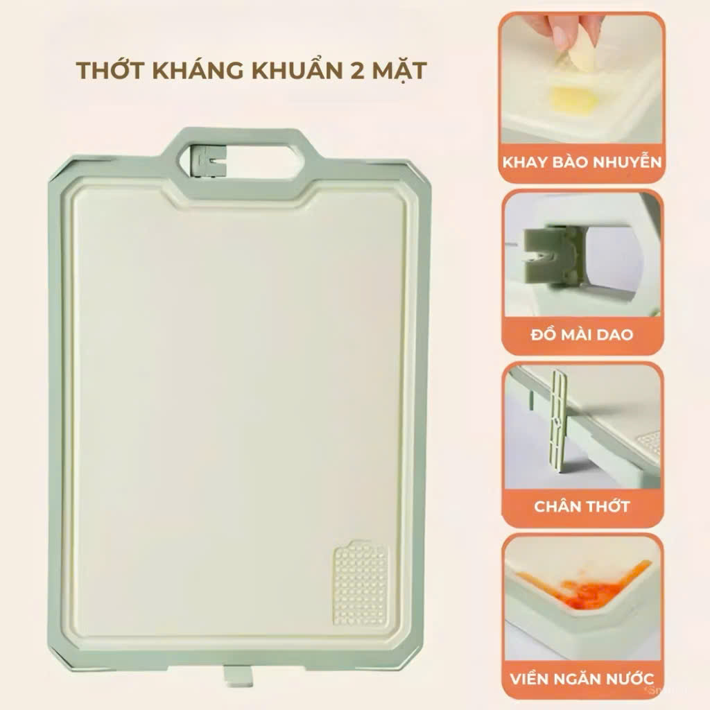 • Kháng khuẩn: Cả mặt thớt inox và mặt sau làm từ nhựa PP kháng khuẩn giúp ngăn ngừa vi khuẩn phát triển, đảm bảo an toàn tuyệt đối khi chế biến thực phẩm.