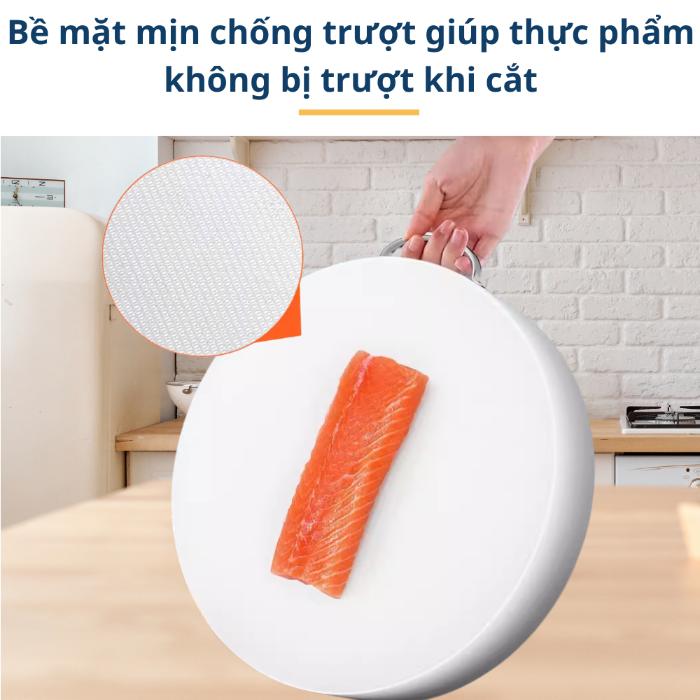 THỚT NHỰA TRÒN CHO GIA ĐÌNH, NHÀ HÀNG, QUÁN ĂN CÔNG DỤNG SẢN PHẨM - Dùng để thái, chặt, cắt, băm thực phẩm: rau củ, thịt, cá, trái cây… - Chống thấm nước, không hút