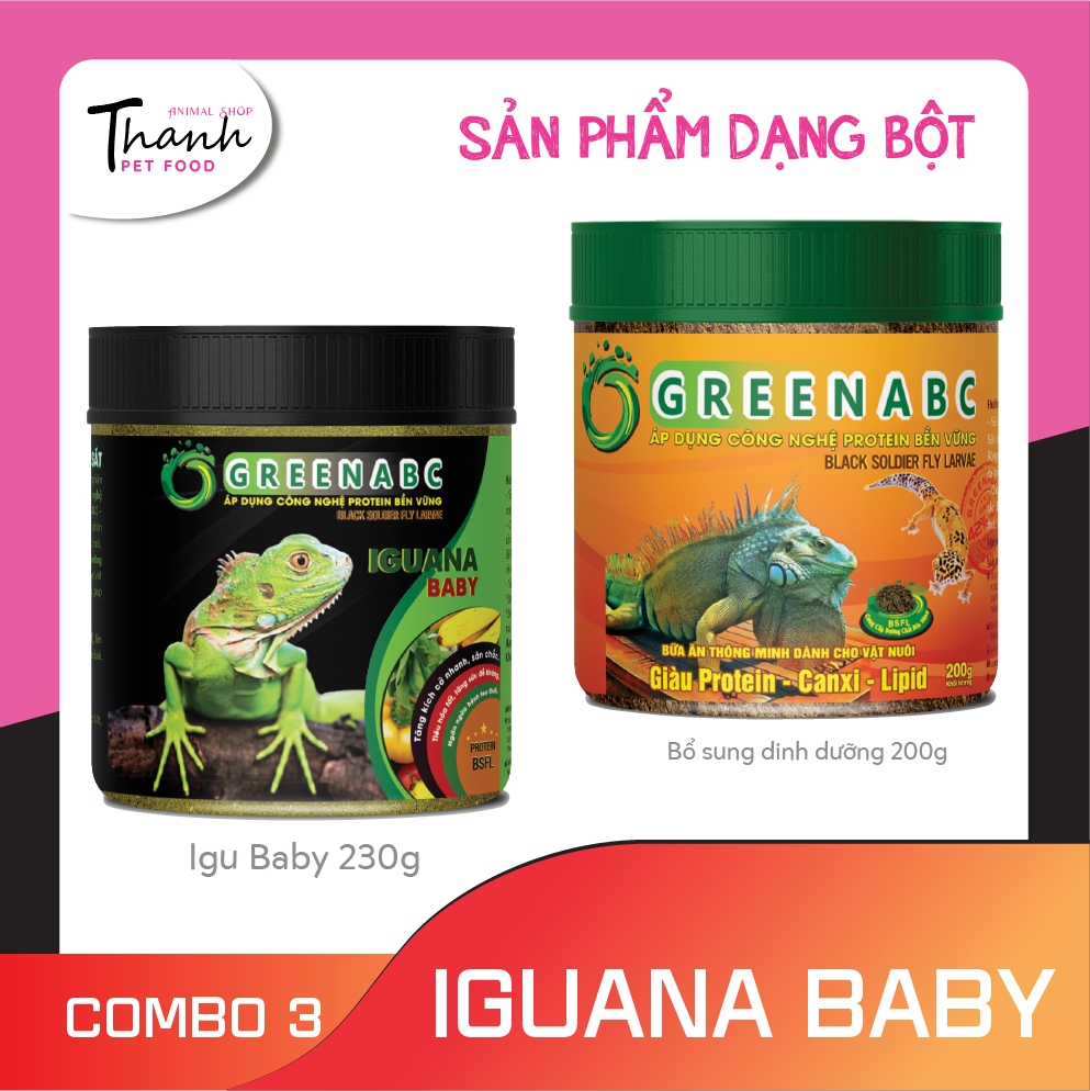 GREENABC là thức ăn cao cấp dành cho Iguana Baby - Rồng Nam Mỹ Baby Đặc biệt sản phẩm GREENABC được sản xuất theo phương pháp Áp dụng công nghệ PROTEIN bền vững từ bột đạm G.Meal rất giàu PROTEIN – CANXI – LIPID có trong BSFL, đã được Mỹ (AAFCO) và EU chấp nhận đưa vào công thức cho ngành sản xuất thức ăn dành cho vật nuôi.