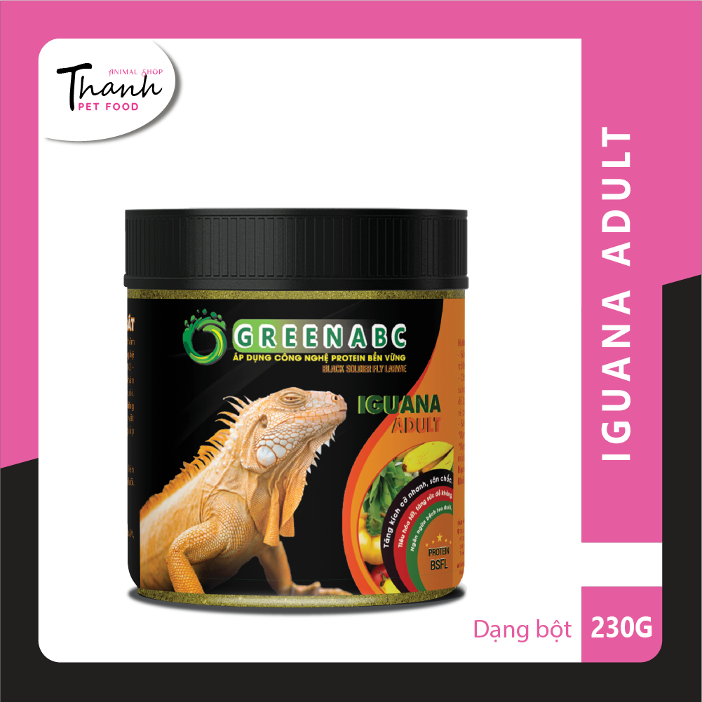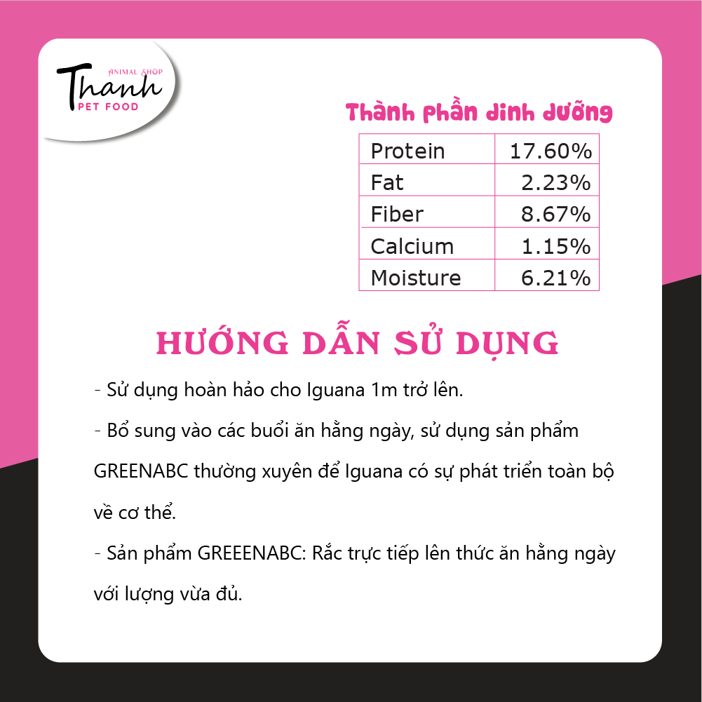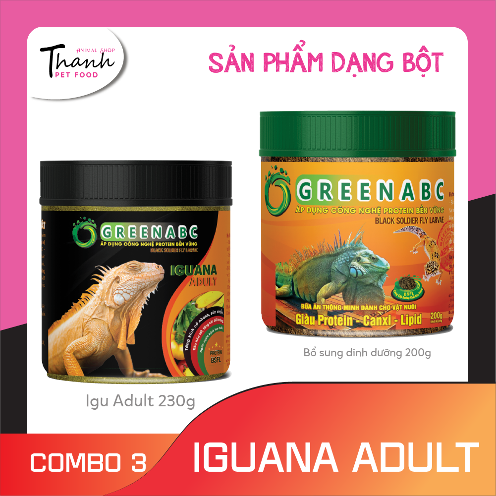 GREENABC - THỨC ĂN IGUANA TRƯỞNG THÀNH - Rồng Nam Mỹ trưởng thành từ 1m trở lên GREENABC là thức ăn cao cấp dành cho Iguana Trưởng Thành - Rồng Nam Mỹ Trưởng Thành. Đặc biệt sản phẩm GREENABC được sản xuất theo phương pháp Áp dụng công nghệ PROTEIN bền vững từ bột đạm G.Meal rất giàu PROTEIN – CANXI – LIPID có trong BSFL, đã được Mỹ (AAFCO) và EU chấp nhận đưa vào công thức cho ngành sản xuất thức ăn dành cho vật nuôi. Sản phẩm GREENABC cung cấp các giá trị dinh dưỡng bền vững cho Iguana với sự kết hợp 90% thành phần có nguồn gốc thực vật và 10% thành phần có nguồn gốc động vật từ côn trùng, giúp cho Iguana:      + Lột da thường xuyên, tăng kích cỡ nhanh, lên màu đẹp.      + Với hàm lượng Canxi 100% nguyên chất có trong BSFL giúp gai bung, đều, ngăn ngừa các bệnh thường gặp như teo đuôi, MBD, sạn,      + Kích thích khứu giác, tăng cường vị giác, giúp Iguana ăn ngon miệng hơn. Đặc biệt với hương thơm tự nhiên, Greenabc kích thích khứu giác của các Iguana Abino T-, giúp các bé ăn tốt hơn.       + Tiêu hóa tốt, cơ thể hấp thụ toàn bộ dưỡng chất cần thiết, giúp cơ thể phát triển toàn diện.      + Cơ thể săn chắc, khỏe mạnh.      + Hỗ trợ tốt trong quá trình mang thai và sinh sản, giúp Iguana hồi phục nhanh chóng sau sinh.      + Giảm thiểu mùi hôi của phân và cơ thể. Combo 1:  Combo 2:  Combo 3:  Ghi chú: Khi sử dụng combo Iguana trưởng thành 3, KHÔNG CẦN BỔ SUNG THÊM CANXI & D3 cho Igu, vì trong combo Igu trưởng thành 3 đã đầy đủ lượng Canxi cho Igu phát triển. Quý Khách Hàng sẽ SIÊU TIẾT KIỆM CHI PHÍ cho việc chăm sóc cho Igu Thành phần dinh dưỡng và hướng dẫn sử dụng: