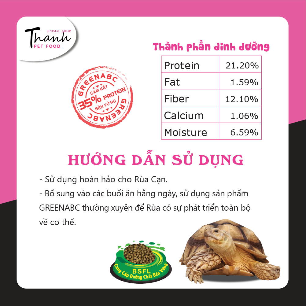 GREENABC - THỨC ĂN RÙA CẠN 100% TỪ THỰC VẬT - HÀM LƯỢNG PROTEIN 20% GREENABC là thức ăn cao cấp dành cho các loại RÙA CẠN. Đặc biệt sản phẩm GREENABC được sản xuất
