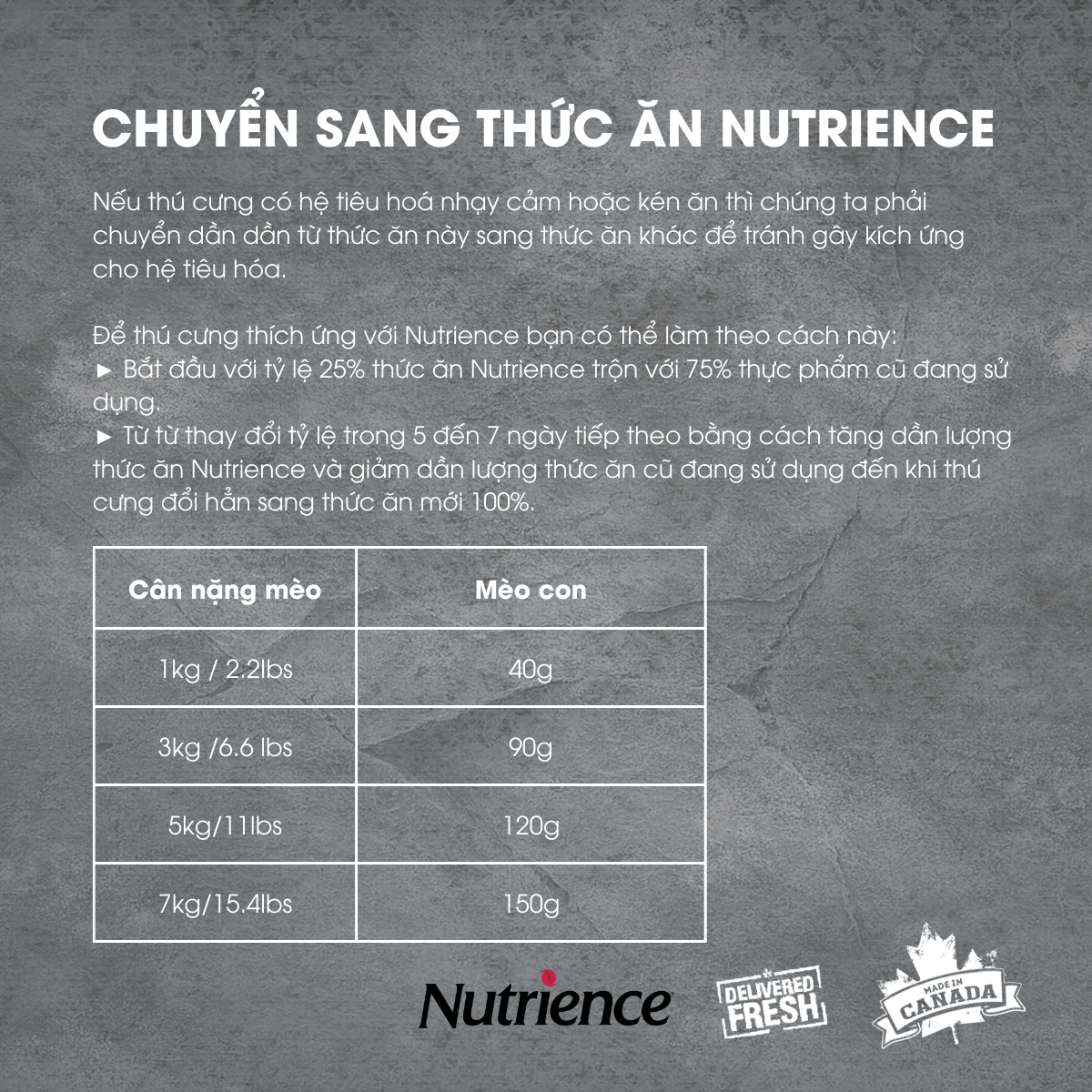 Điều quan trọng là phải chuyển dần dần mèo con của bạn từ thức ăn này sang thức ăn khác. Bắt đầu với tỷ lệ 25% thức ăn Nutrience trộn với 75% thức ăn cũ. Từ từ thay đổi tỷ lệ trong 5 đến 7 ngày tiếp theo bằng cách tăng dần lượng thức ăn Nutrience và giảm dần lượng thức ăn cũ.