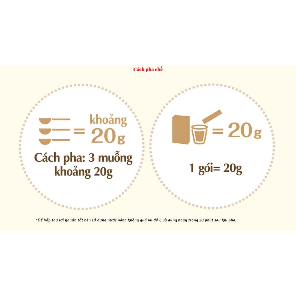 • 10 tỷ bào tử LAC-Shield (Lactobacillus paracasei MCC1849) là 1 “probiotics chuyên nghiệp” bảo vệ hệ tiêu hoá cũng như kích thích hệ miễn dịch Đối tượng sử dụng: Người lớn, người già cần bổ sung dinh dưỡng, tăng cường đề kháng. Người bệnh hoặc sau phẫu thuật cần hồi phục. Người bệnh tiểu đường, huyết áp, tim mạch. Trẻ em trên 3 tuổi. Hướng dẫn sử dụng: Bước 1: Vệ sinh sạch sẽ dụng cụ pha sữa trước khi tiến hành pha sữa. Bước 2: Cho 100ml nước ấm (hoặc nhiệt độ mong muốn) dưới 40 độ C vào ly pha với 1 gói sữa (tương đương 20g) Bước 3: Khuấy đều và uống trong vòng 20 phút sau khi pha. Lưu ý: Để hấp thụ lợi khuẩn tốt nên sử dụng nước nóng không quá 40 độ C và dùng ngay trong 20 phút sau khi pha. Quy cách đóng gói Thùng 12 lon x 300gr **Thực phẩm này không phải là thuốc và không có tác dụng thay thế thuốc chữa bệnh. ***Bao bì sản phẩm có thể thay đổi theo từng đợt hàng.