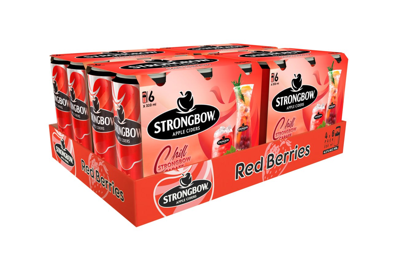 Thành phần: Strongbow Apple Red Berries (Dâu đỏ): Nước, nước táo lên men với sucrose (cider), si-rô, nước ép (với 0,7% dâu tây), chất điều chỉnh độ acid (E296), chất bảo quản Kali Metabisulfit (E224), hương dâu đỏ tự nhiên.