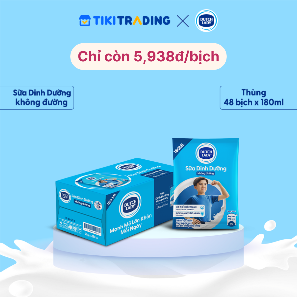 - Thùng 48 Bịch Sữa Tiệt Trùng Dutch Lady Cô Gái Hà Lan Không Đường 180ml - Sữa Bịch Tiệt Trùng Cô Gái Hà Lan bổ sung Can-xi, Phốt pho, Vitamin B2, B12 giúp