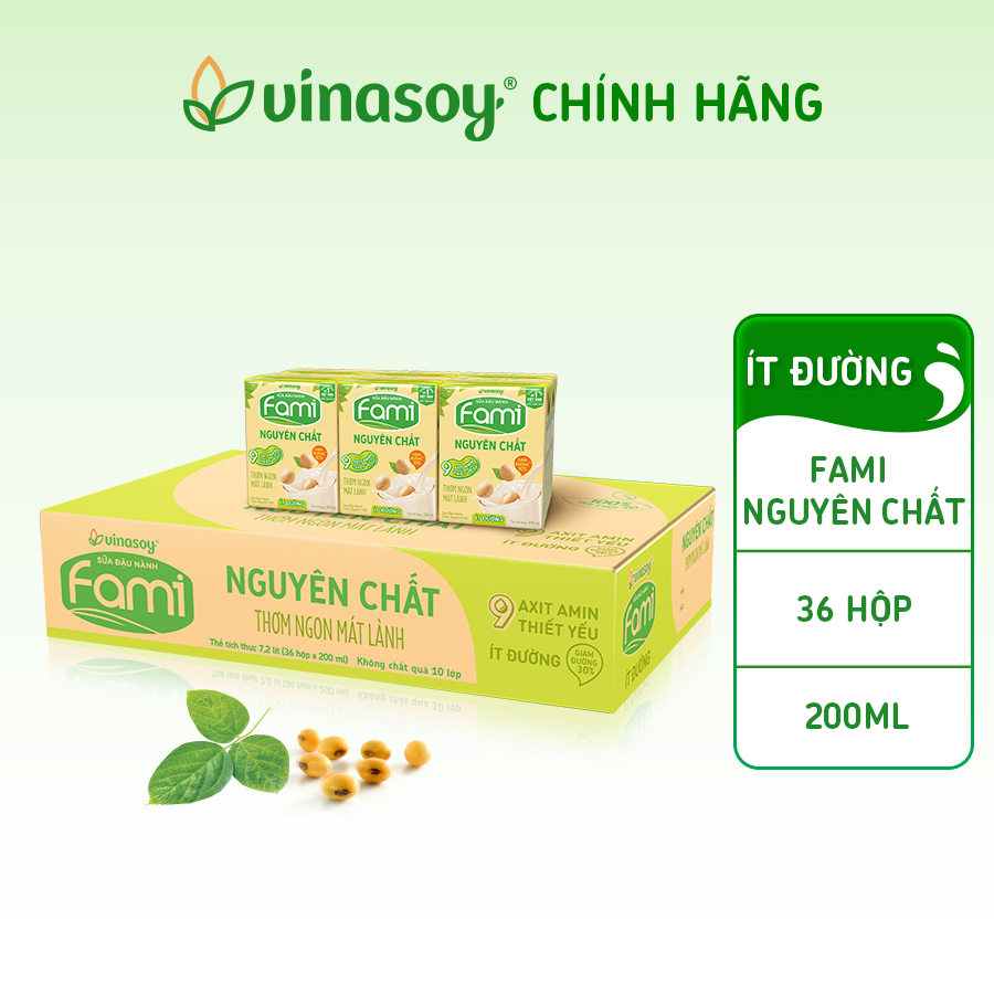 - Thùng Sữa đậu nành Fami nguyên chất (200ml x 36 Hộp) được làm từ 100% đậu nành hạt chọn lọc, không biến đổi Gen (Non - GMO). - Sữa đậu nành chứa nhiều protein,