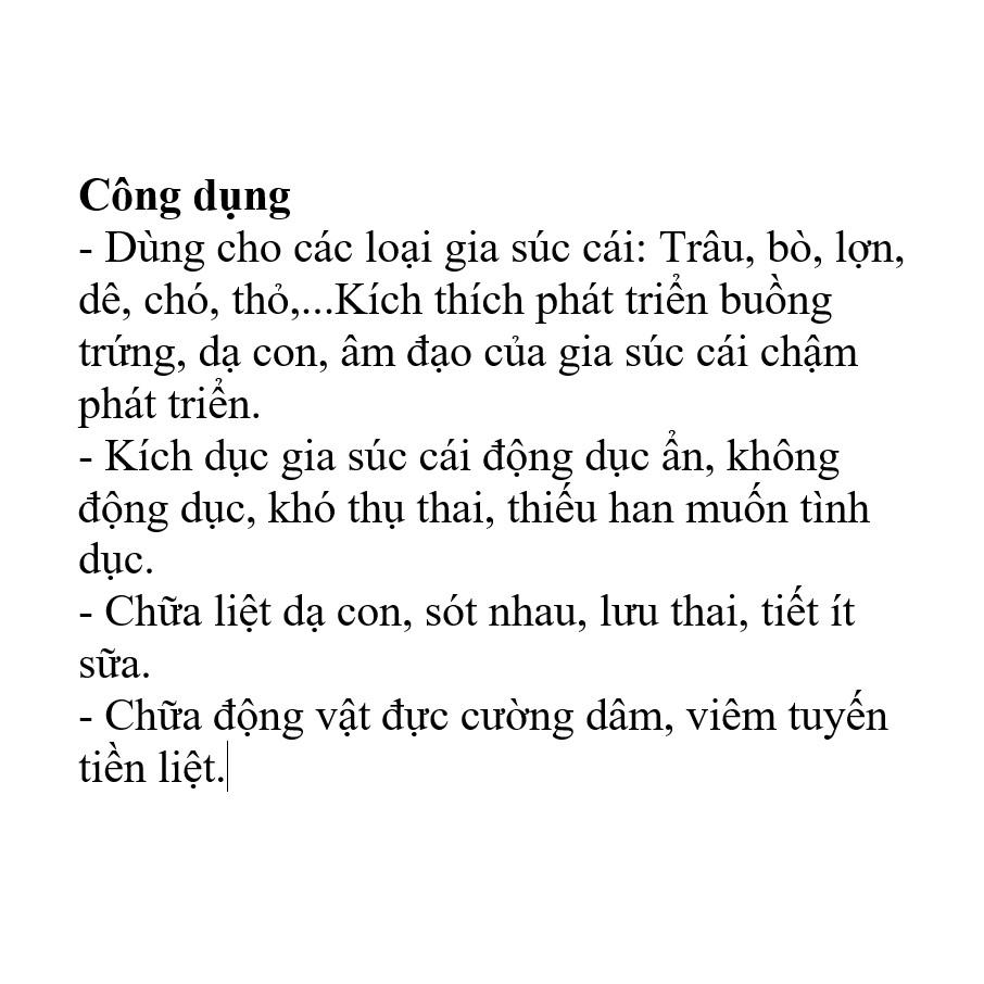 sảnn phẩmbgiups heo lên giống để phố kết hợp ho chăn nuôi giúp vật nuôi tăng sức đề kháng, ngăn ngừa bệnh giúp ít cho bà con chăn nuôi Sản phẩm này là tài sản