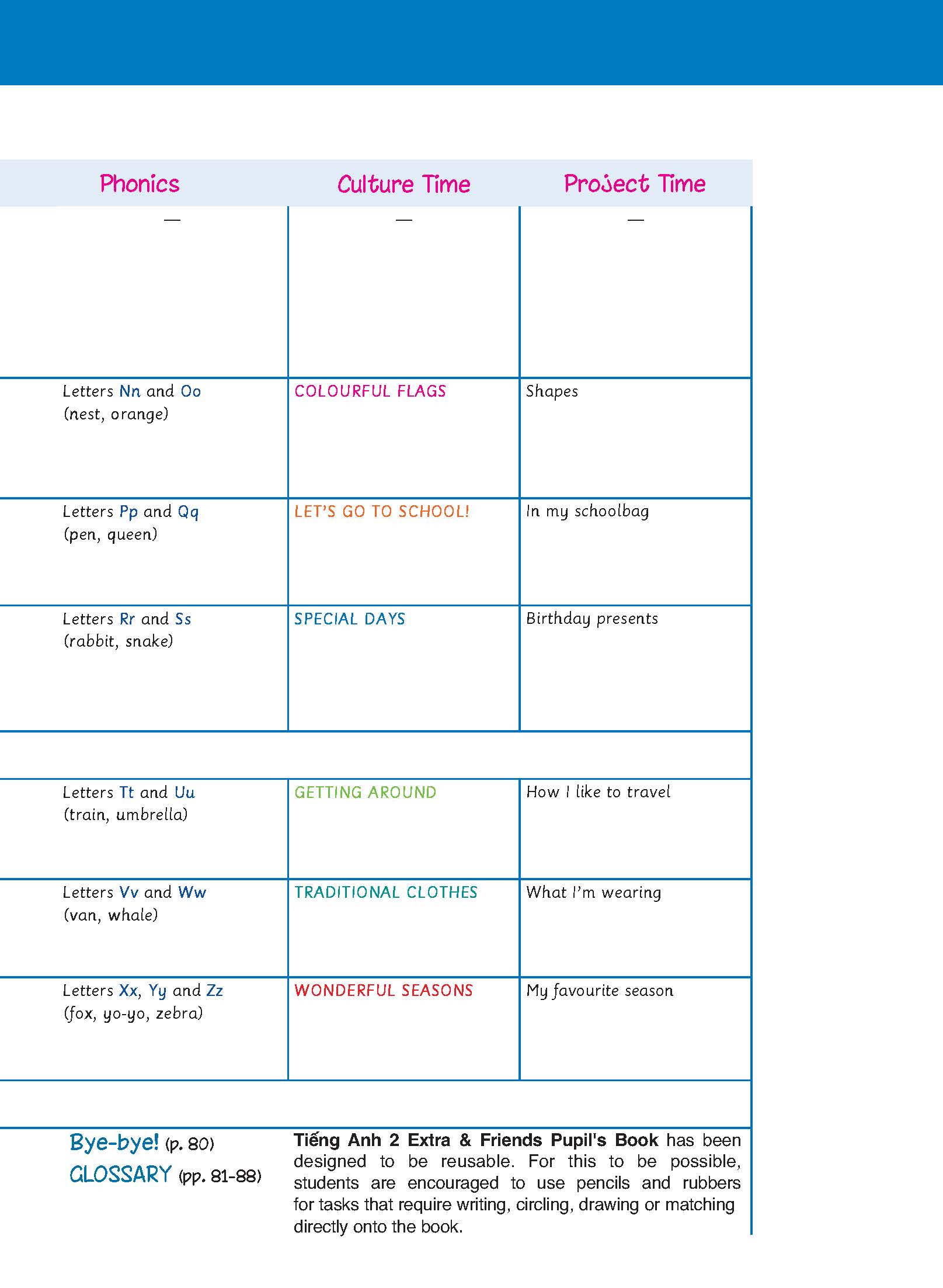 Bộ sách gồm: sách bài học, sách bài tập, vở tập viết. EXTRA and FRIENDS là một khóa học 5 cấp độ dành cho học sinh sơ cấp Tiếng Anh. Bộ sách theo chương trình