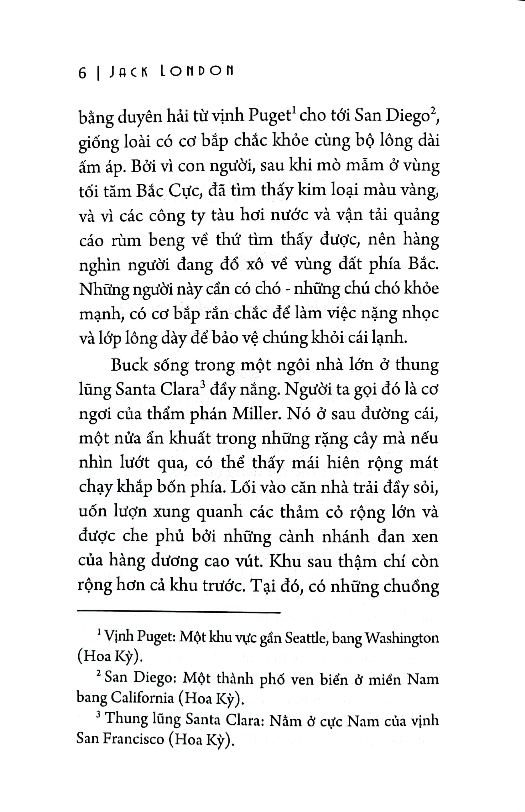 “Buck nằm đấy suốt quãng thời gian còn lại của buổi tối mệt mỏi, ôm nỗi phẫn nộ và lòng kiêu hãnh đã bị tổn thương. Nó không sao hiểu nổi tất cả mọi chuyện vừa xảy ra. Những kẻ lạ mặt kia muốn gì ở nó chứ? Sao họ lại giam giữ nó trong cái thùng thưa chật hẹp này? Nó không biết tại sao, nhưng nó cảm thấy bức bối bởi dự cảm mơ hồ về một tai họa đương lơ lửng đâu đó. Nhiều lần trong đêm, nó đứng phắt dậy khi cánh cửa căn chòi lạch cạch mở, mong thấy ngài Thẩm phán hay chí ít là các cậu chủ. Nhưng lần nào cũng là bản mặt phì nộn của tay chủ quán rượu đang nhìn chằm chằm vào nó dưới ánh sáng leo lét của ngọn nến làm từ mỡ bò. Và lần nào, tiếng sủa đầy vui mừng mới rung lên trong họng Buck cũng biến thành tiếng gầm gừ giận dữ.”