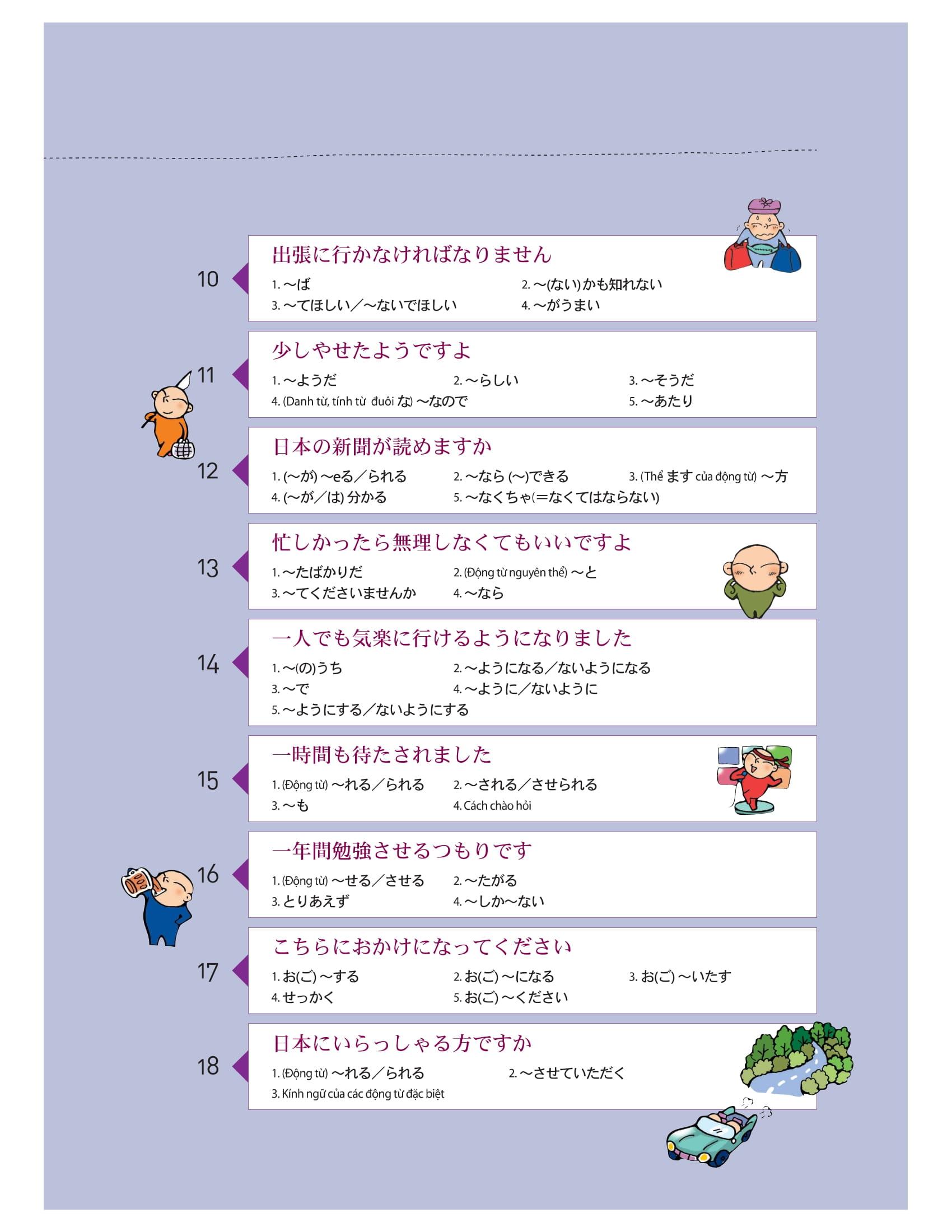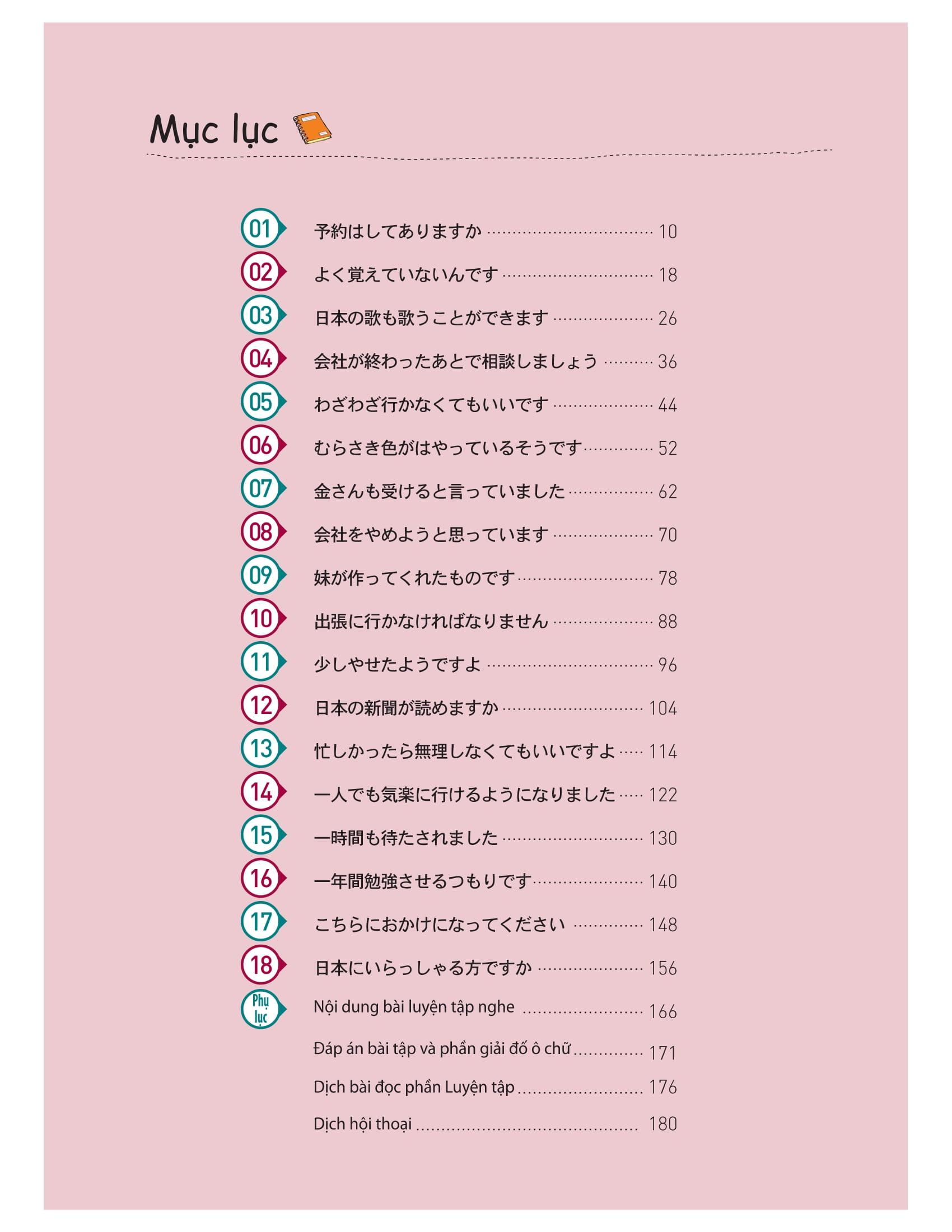 – Cuốn sách gồm tổng cộng 18 bài, mỗi bài bao gồm cả nội dung về hội thoại và ngữ pháp cơ bản.