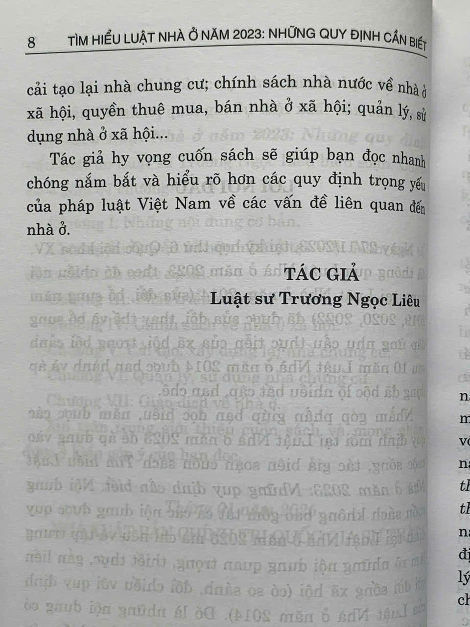 Tìm hiểu Luật Nhà ở năm 2023- Những quy định cần biết Tác giả: Luật sư Trương Ngọc Liêu Nhà xuất bản: Chính trị quốc gia Sự thật Ngày xuất bản: 2.2025 Công ty phát hành: Nhà xuất bản Chính trị quốc gia Sự thật Khổ sách: 14,5*20,5cm Số trang: 456 Giá bìa: 100.000 đ Ngày 27/11/2023, tại kỳ họp thứ 6, Quốc hội khóa XV, đã thông qua Luật Nhà ở năm 2023, theo đó nhiều nội dung tại Luật Nhà ở năm 2014 (sửa đổi, bổ sung năm 2019, 2020, 2022) đã được sửa đổi, thay thế và bổ sung đáp ứng nhu cầu thực tiễn của xã hội, trong bối cảnh sau 10 năm Luật Nhà ở năm 2014 được ban hành và áp dụng đã bộc lộ nhiều bất cập, hạn chế. Nhằm góp phần giúp bạn đọc hiểu, nắm được các quy định mới tại Luật Nhà ở năm 2023 để áp dụng vào cuộc sống, tác giả biên soạn cuốn sách Tìm hiểu Luật Nhà ở năm 2023: Những quy định cần biết. Nội dung cuốn sách không bao gồm tất cả các nội dung được quy định tại Luật Nhà ở năm 2023 mà chỉ nêu và tập trung làm rõ những nội dung quan trọng, thiết thực, gắn liền với đời sống xã hội (có so sánh, đối chiếu với quy định của Luật Nhà ở năm 2014). Đó là những nội dung có nhiều quan điểm tranh luận gay gắt khi lấy ý kiến góp ý dự thảo Luật Nhà ở như: Vấn đề quyền sở hữu nhà ở của người Việt Nam định cư ở nước ngoài; vấn đề thời hạn sở hữu nhà chung cư, phần sở hữu chung, riêng, bãi đậu xe, quản lý, vận hành nhà chung cư, việc xây dựng, cải tạo lại nhà chung cư; chính sách nhà nước về nhà ở xã hội, quyền thuê mua, bán nhà ở xã hội; quản lý, sử dụng nhà ở xã hội... Tác giả hy vọng cuốn sách sẽ giúp bạn đọc nhanh chóng nắm bắt và hiểu rõ quy định trọng yếu ất và hiểu rõ hơn các quy định trọng yếu của pháp luật Việt Nam về các vấn đề liên quan đến nhà ở.