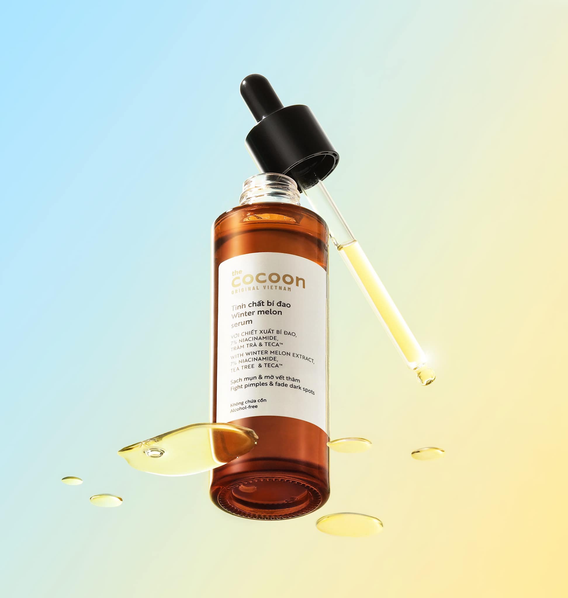 - Vitamin B3 (Niacinamide): Giúp hỗ trợ sạch mụn hiệu quả, kiểm soát lượng dầu thừa và làm giảm sự xuất hiện của lỗ chân lông to. Thành phần đầy đủ tinh chất bí đao cocoon Aqua/Water, Niacinamide, Salicylic Acid, Cocamidopropyl Dimethylamine, Benincasa Cerifera Fruit Extract, Centella Asiatica Extract, Butylene Glycol, Pentylene Glycol, Bisabolol, Zinc PCA, Phellodendron Amurense Bark Extract, Glycereth-26, Bis-PEG-18 Methyl Ether Dimethyl Silane, Melaleuca Alternifolia Leaf Oil, Lavandula Angustifolia Flower Oil, Rosmarinus Officinalis Leaf Oil, Phenoxyethanol, Trisodium Ethylenediamine Disuccinate, Ethylhexylglycerin, Farnesol. Hướng dẫn sử dụng tinh chất bí đao cocoon Lấy vài giọt tinh chất vào lòng bàn tay, xoa đều và mát-xa lên da mặt sạch, tránh vùng mắt. Sử dụng sáng và tối. Cam kết tinh chất bí đao cocoon