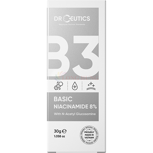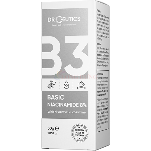 Tinh chất DrCeutics Basic Niacinamide 8% Thành phần: Niacinamide: Tạo hàng rào lipid, điều tiết dầu, hỗ trợ làm giảm và cải thiện tình trạng mụn. Bảo vệ khỏi tác hại của ánh nắng mặt