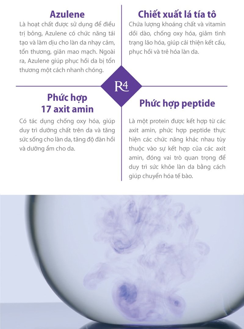 - Chứa Azulene kết hợp với phức hợp CalmYang chiết xuất từ 7 loại thảo mộc giúp Ampoule Collagen R4 phục hồi và tái tạo da hiệu quả, bảo vệ và ngăn ngừa da khỏi tổn thương bằng cách tăng cường hàng rào bảo vệ da vượt trội.