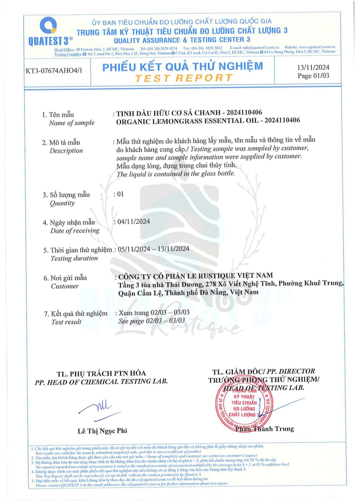► THÀNH PHẦN: 100% tinh dầu sả chanh hữu cơ với các thành phần chính như: Geranial - Citral A (35-47%), Neral - Citral B (25-40%), Geranyl acetate (0,5-6,0%), Geraniol (1,5-8,0%). Quét mã QR để xem kết quả phân tích GC-MS về hàm lượng của các thành phần trong tinh dầu.