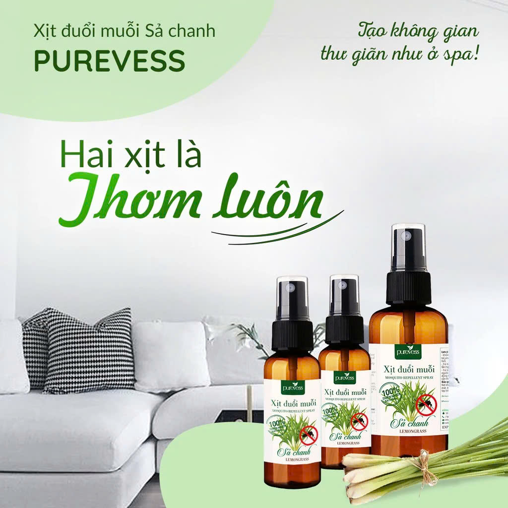 - Thành phần : Tinh dầu Sả Chanh, cồn thực phẩm Tinh dầu đuổi muỗi sả chanh Purevess - dạng xịt là sự kết hợp các loại tinh dầu thiên nhiên có khả năng xua đuổi côn trùng và muỗi, tạo nên một loại xịt phòng an toàn cho sức khỏe của gia đình bạn và trẻ em trong gia đình