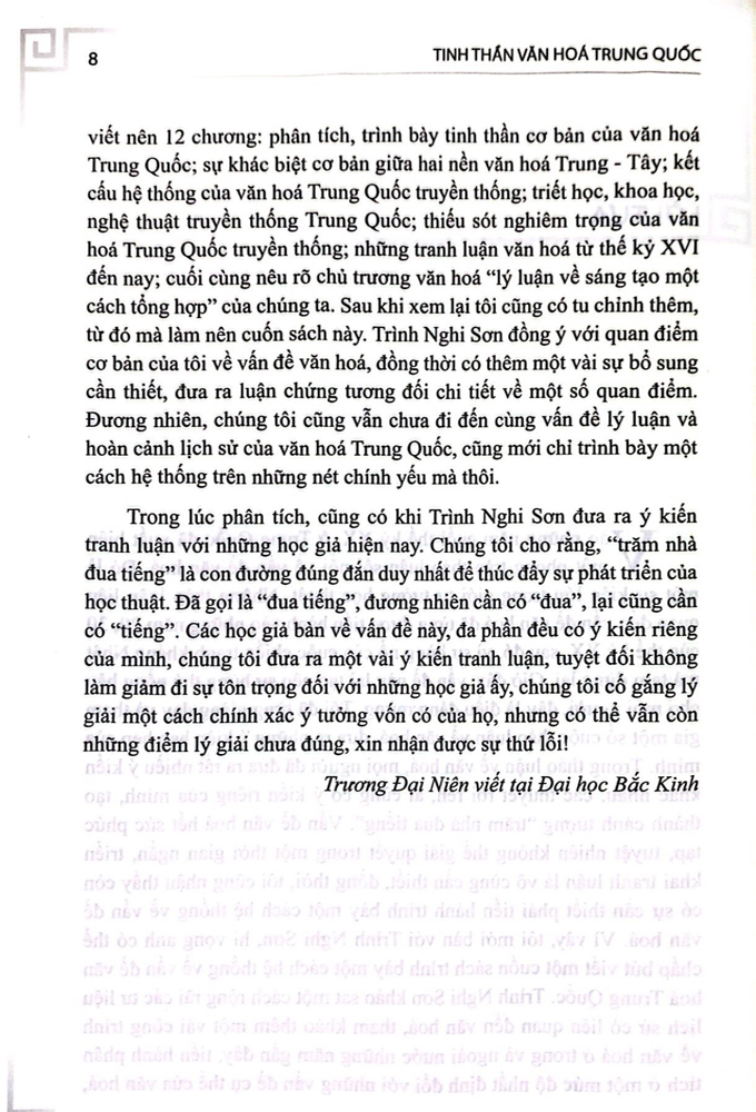 Tinh thần văn hóa Trung Quốc Cuốn sách bao gồm 12 chương: Chương 1: Tinh thần cơ bản của văn hóa TQ Chương 2: Sự khác biệt cơ bản giữa văn hóa TQ và văn hóa phương Tây (Phần thượng) Chương 3: Sự khác biệt cơ bản giữa văn hóa TQ và văn hóa phương Tây (Phần hạ) Chương 4: Hệ thống văn hóa truyền thống TQ Chương 5: Sự phát triển của văn hóa Tq Chương 6: Cốt lõi của văn hóa truyền thống TQ  -triết học truyền thống TQ Chương 7: Thành tựu của văn hóa truyền thống TQ Chương 8: Những xu hướng tiêu cực trong văn hóa truyền thông TQ Chương 9: Những tranh luận về văn hóa TQ (Thượng) Chương 10: Những tranh luận về văn hóa TQ (Trung) Chương 11: Những tranh luận về văn hóa TQ (Hạ) Chương 12: Chủ trương văn hóa của TQ - Lý luận sáng tạo tổng hợp    Tác giả Trương Đại Niên là nhà triết học, nhà văn hóa học, bậc thầy về quốc học ở Trung Quốc đương đại. Ban đầu ông giảng dạy ở Đại học Thanh Hoa, sau đảm nhận vị trí Giáo sư Đại học Bắc Kinh trong một thời gian dài, từng giữ chức Hội trưởng Hội Sử học triết học Trung Quốc. Ông cả đời nghiên cứu triết học và văn hóa Trung Quốc, là bậc thầy về quốc học có danh tiếng rất lớn ở cả trong và ngoài nước. Tác phẩm tiêu biểu của ông thời kỳ đầu là "Đại cương triết học Trung Quốc", đã giải thích được tiến trình phát triển của triết học Trung Quốc, là một tác phẩm kinh điển của triết học Trung Quốc hiện đại; tác phẩm tiêu biểu của ông giai đoạn cuối đời là "Tinh thần văn hóa Trung Quốc", nghiên cứu một cách hệ thống những đặc điểm của văn hóa Trung Quốc, thể hiện một trình độ rất cao về nghiên cứu và phổ cập văn hóa Trung Quốc. Ông dạy học không biết mệt mỏi, có học trò ở khắp nơi.    Tác giả Trình Nghi Sơn, nghiên cứu sinh khóa đầu tiên do Trương Đại Niên hướng dẫn, nhà nghiên cứu văn hóa Trung Quốc nổi tiế Tác giả: TRƯƠNG ĐẠI NIÊN - TRĨNH NGHI SƠN Dịch giả: BÙI BÁ QUÂN - LÊ DĨNH SƠN - HOÀNG MINH QUÂN Nhà xuất bản:      NXB Đại Học Quốc Gia Hà Nội Năm xuất bản:    2023 Số trang:               486 Kích thước:          16 x 24 cm Loại bìa:               Bìa mềm tay gấp