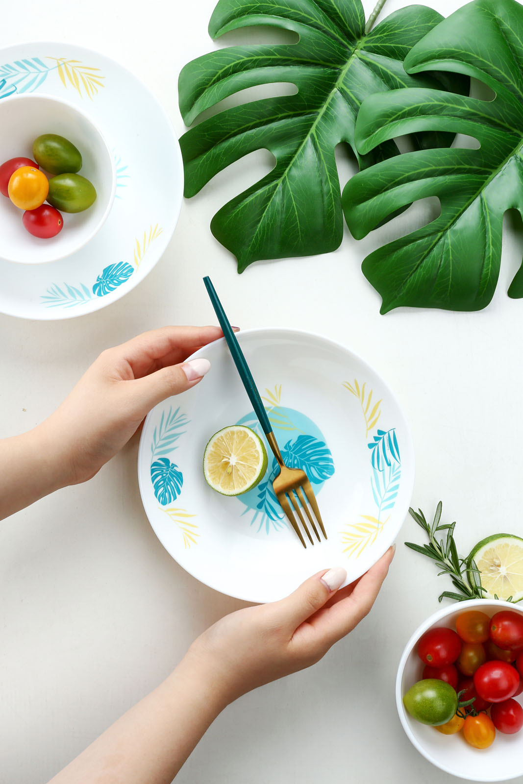 - Đặc tính nổi bật: cường lực, kháng vỡ nhiều lần so với thuỷ tinh thông thường. Thiết kế lá mostera nhiệt đới tạo cảm giác mát mẻ cho bàn ăn.