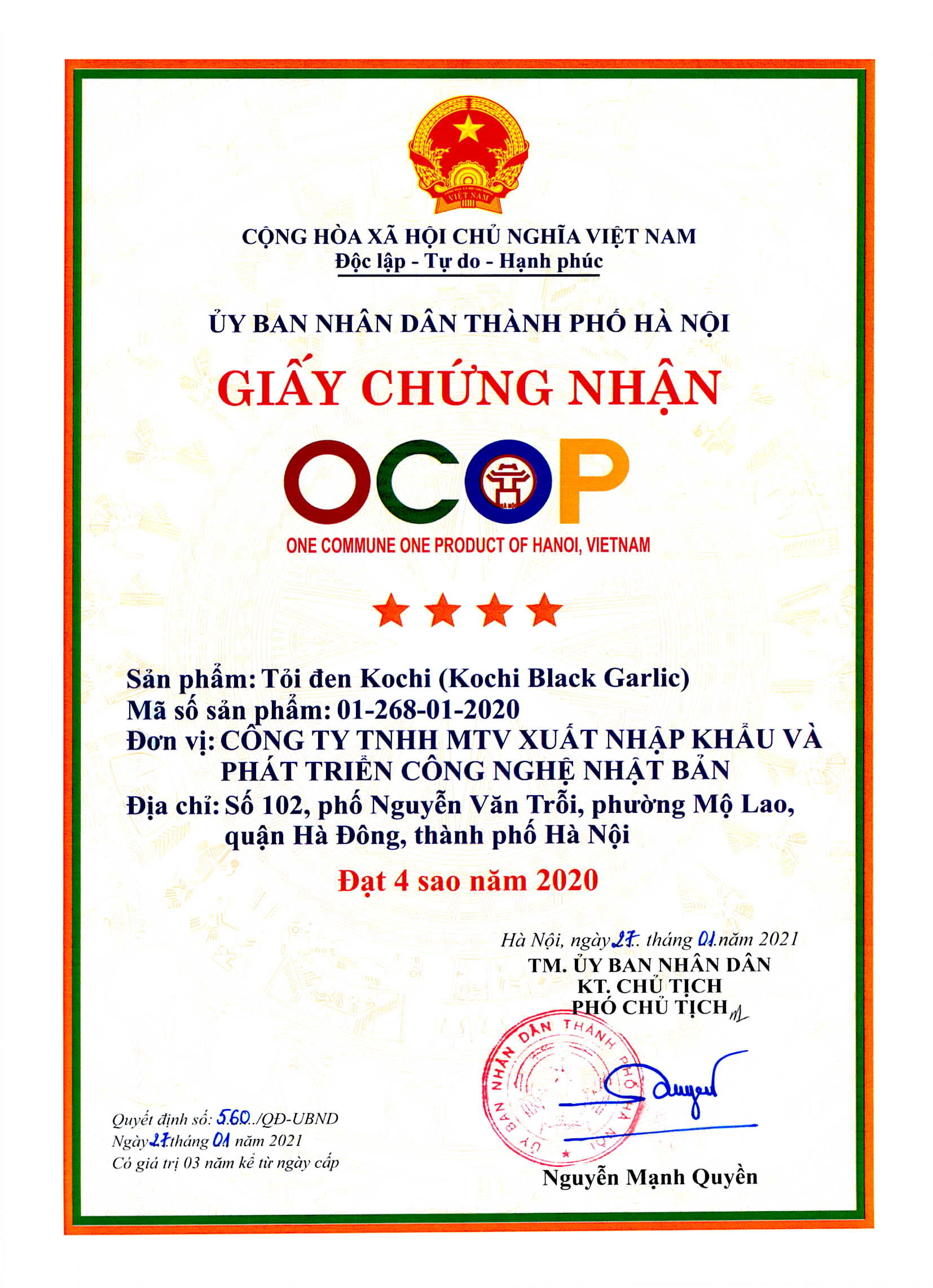 Tỏi đen KOCHI được nghiên cứu phát triển bởi Tiến sĩ, dược sĩ Đào Văn Đôn. Năm 2008, trong chuyến học tập tại Hàn Quốc, TS Đôn đã được thầy GS người Hàn Quốc hướng dẫn về cách lên men tỏi đen theo công nghệ Nhật Bản. Khi về Việt Nam, TS Đôn đã cải tiến qui trình lên men Tỏi đen. Từ 1 lần lên men, thành 2 lần lên men, vì vậy, chất lượng tỏi đen đã tăng lên nhiều. Tỏi đen Kochi được lên men từ nguyên liệu Tỏi cô đơn tía của các tỉnh phía Bắc Việt Nam: Hải Dương, Lạng Sơn,... Những củ tỏi đen cô đơn được phân loại, loại bỏ những củ hỏng, dập, trầy xước. Sau đó rửa bằng nước sạch và để ráo. Quá trình lên men nóng: Tỏi cô đơn sau khi ráo thì được xếp vào khay và đưa vào hầm lên men nóng, có sự kiểm soát nhiệt độ và độ ẩm. Tỏi được kiểm tra liên tục trong quá trình lên men. Quá trình lên men lạnh: Tỏi được chuyển vào tủ sấy và sấy trong thời gian thích hợp tới khi đạt được độ ẩm, giúp ổn định hoạt chất, nâng cao chất lượng của củ tỏi đen. Tỏi đen Kochi bên ngoài khô ráo, bên trong mềm dẻo, vị ngọt tự nhiên, đảm bảo tiêu chuẩn. Tỏi đen Kochi đã đạt được nhiều danh hiệu uy tín như TOP 1 hàng Việt Nam được người tiêu dùng yêu thích bình chọn; Hàng Việt Nam chất lượng cao; OCOP 4 sao. Tới nay, tỏi đen Kochi đã và đang xuất khẩu nhiều nước trên thế giới như Mỹ, Thụy Sĩ, Hàn Quốc. Khối lượng tịnh: 250g THÀNH PHẦN: