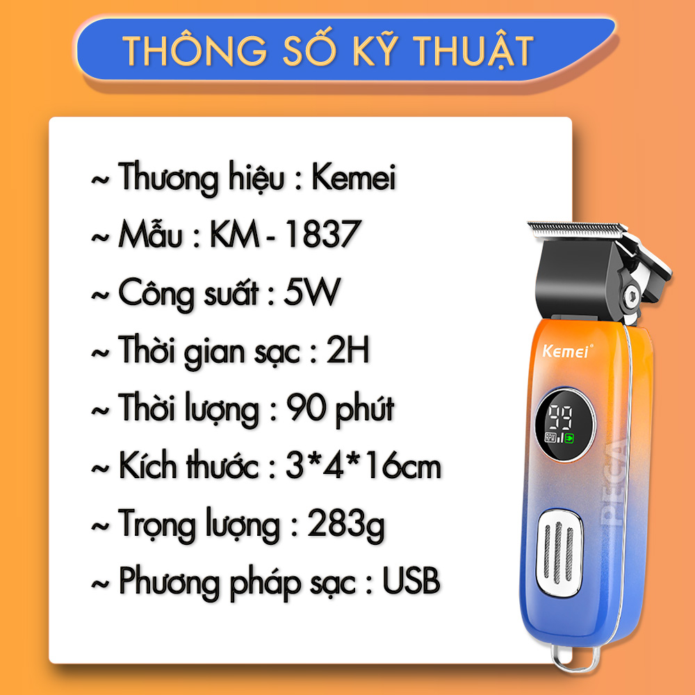 Mua tại TiktokTÔNG ĐƠ CẮT TÓC KHÔNG DÂY KEMEI KM-1837 GIỚI THIỆU VỀ TÔNG ĐƠ CẮT TÓC CHẤN VIỀN Tông đơ sở hữu chức năng 2 mức tốc độ cắt tiện lợi Cho bạn đa dạng sự lựa chọn khi cắt tóc. Có thể sử dụng cho cả trẻ em và người lớn. Lưỡi cắt thiết kế độc đáo với thiết kế lưỡi nghiên giúp tản nhiệt tốt hơn và có thêm nắp cố định có thể tháo rời cho công việc cắt tỉa dễ dàng. MÀN HÌNH LCD THÔNG MINH