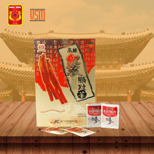Trà Hồng Sâm Hàn Quốc Korean Red Ginseng Granule Tea     Hồng sâm sẽ giúp bồi bổ sức khỏe, tăng khả năng làm việc, giúp đầu óc minh mẫn, sảng khoái, nâng cao hiệu quả làm việc và tăng cường trí nhớ. Sản phẩm dùng cho người trưởng thành, không dùng cho phụ nữ mang thai. Hồng sâm Hàn Quốc luôn được coi là "Kho báu từ phương Đông" và luôn là sản phẩm quý dùng để bồi bổ và tăng cường sức khỏe cho mọi người. Với các dưỡng chất tuyệt vời có trong hồng sâm, các sản phẩm được chiết xuất từ hồng sâm khi sử dụng đều đặn với liều lượng hợp lý sẽ giúp tăng cường sức khỏe, nâng cao sức đề kháng, giảm căng thăng, mệt mỏi, giúp tinh thần tỉnh táo, minh mẫn, hệ thống tuần hoàn được nâng cao, kích thích tiêu hóa. Bên cạnh đó, hồng sâm còn có tác dụng cân bằng nội tiết tố ở cả nam và nữ, gia tăng chất lượng cuộc sống. Từ đó, cơ thể sẽ giảm thiểu được các bệnh như huyết áp, mỡ máu, tai biến, tiểu đường, rối loạn nội tiết.   Trà Hồng Sâm Korean Red Ginseng Granule Tea (Hộp 50 Gói x 3g) được sản xuất từ tinh chất hồng sâm 6 tuổi, có chứa 34 loại saponin khác nhau và những thành phần hoạt tính đa dạng khác như hợp chất fenolic, hợp chất polyacetylene, protein, các acidamin, mang lại loại trà thượng hạng thơm ngon và tốt cho sức khỏe. ️ Thành phần: