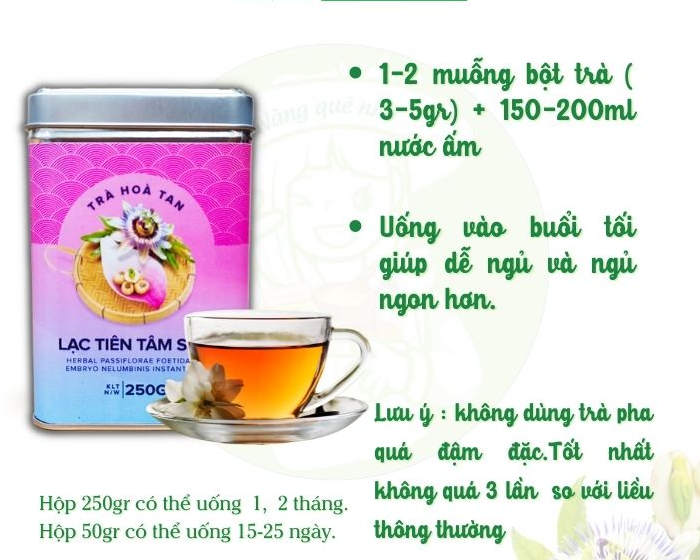 Mua tại TiktokTrà hòa tan Lạc Tiên Tâm Sen là sự kết hợp giữa hai thành phần quý là Lạc Tiên và Tâm Sen, được chiết xuất, cô đặc và chế biến thành dạng trà hòa tan rất tiện dụng, thơm ngon, dễ uống.