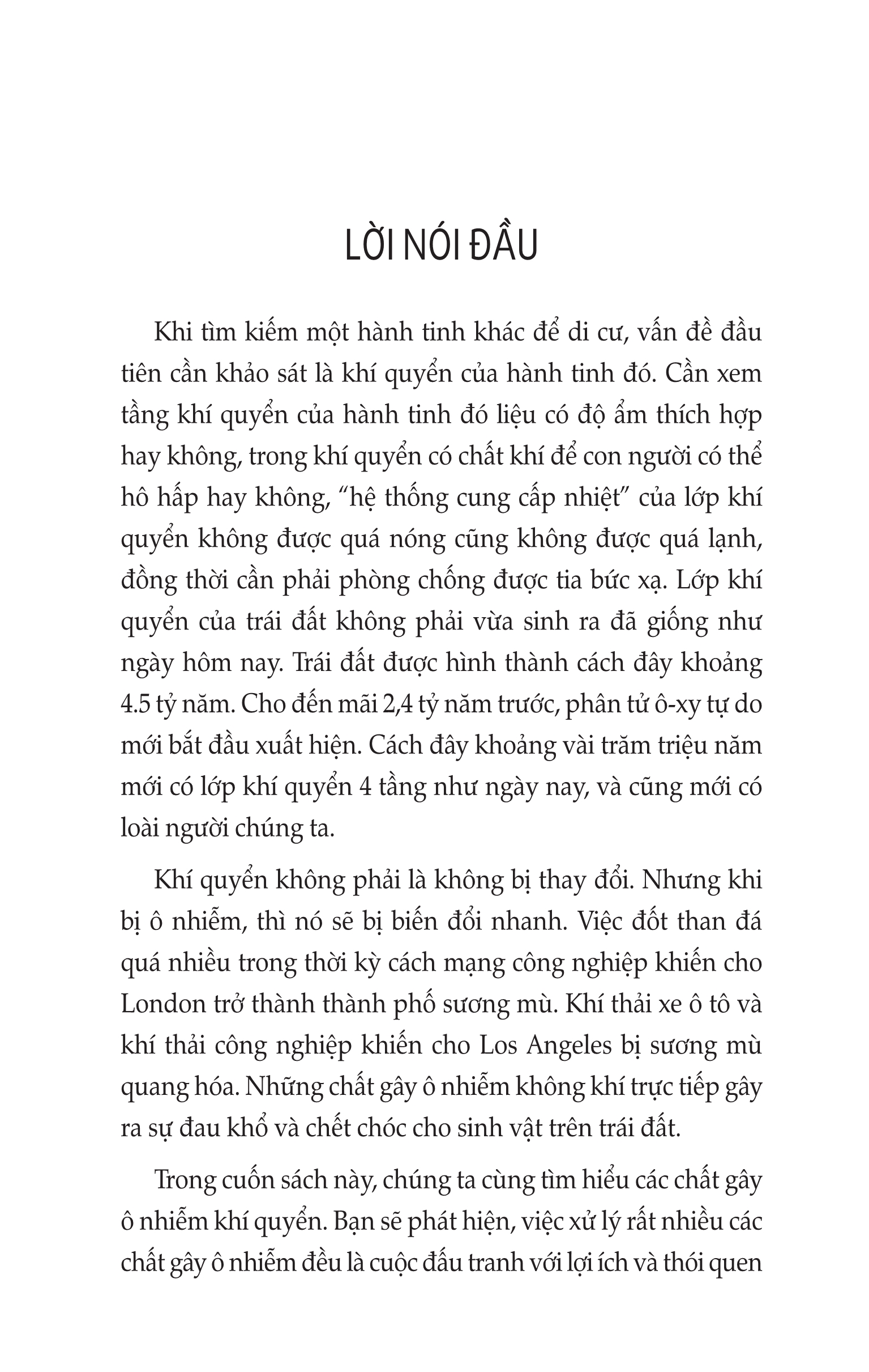 Khi tìm kiếm một hành tinh khác để di cư, vấn đề đầu tiên cần khảo sát là khí quyển của hành tinh đó. Cần xem tầng khí quyển của hành tinh đó liệu có độ ẩm thích hợp hay không, trong khí quyển có chất khí để con người có thể hô hấp hay không, “hệ thống cung cấp nhiệt” của lớp khí quyển không được quá nóng cũng không được quá lạnh, đồng thời cần phải phòng chống được tia bức xạ. Lớp khí quyển của trái đất không phải vừa sinh ra đã giống như ngày hôm nay. Trái đất được hình thành cách đây khoảng 4.5 tỷ năm. Cho đến mãi 2,4 tỷ năm trước, phân tử ô-xy tự do mới bắt đầu xuất hiện. Cách đây khoảng vài trăm triệu năm mới có lớp khí quyển 4 tầng như ngày nay, và cũng mới có loài người chúng ta.             Khí quyển không phải là không bị thay đổi. Nhưng khi bị ô nhiễm, thì nó sẽ bị biến đổi nhanh. Việc đốt than đá quá nhiều trong thời kỳ cách mạng công nghiệp khiến cho London trở thành thành phố sương mù. Khí thải xe ô tô và khí thải công nghiệp khiến cho Los Angeles bị sương mù quang hóa. Những chất gây ô nhiễm không khí trực tiếp gây ra sự đau khổ và chết chóc cho sinh vật trên trái đất.             Trong cuốn sách này, chúng ta cùng tìm hiểu các chất gây ô nhiễm khí quyển. Bạn sẽ phát hiện, việc xử lý rất nhiều các chất gây ô nhiễm đều là cuộc đấu tranh với lợi ích và thói quen của con người. Chẳng hạn, việc nghiêm cấm sử dụng xăng chứa chì gây tổn hại cho ngành công nghiệp hóa học, việc đưa ra các tiêu chuẩn nghiêm ngặt đối với khí thải xe hơi đã đe dọa ngành công nghiệp xe hơi. Thậm chí, hạn chế lái xe hơi và đốt than, đều ảnh hưởng đến thói quen sinh hoạt của con người. Bạn cũng hiểu được rằng, bây giờ có thể dùng phương pháp gì để làm sạch khí quyển. Mỗi một đồ vật mà chúng ta sử dụng đều có nguồn gốc, và có một nơi để đi về. Chúng ta không muốn rằng cuối cùng chúng sẽ biến thành vật gây ô nhiễm. Không khí trong lành là báu vật có giá trị nhất đối với loài người.