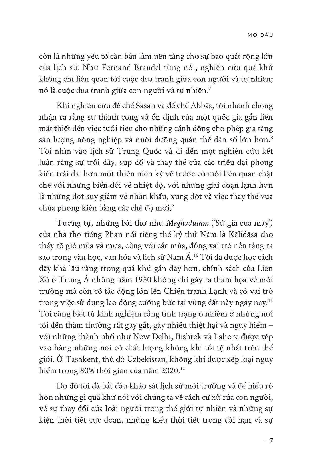 - Cuốn sách này không nói về những gì sẽ diễn ra trong tương lai. Mục đích của nó không phải để thách thức những tiếng nói đồng thanh mang tính áp đảo của cộng đồng khoa học, cũng không tập trung vào các điều kiện toàn cầu hiện tại hay xem xét những bước đi nào có thể giảm thiểu một số hoặc thậm chí là nhiều vấn đề tồi tệ nhất do biến đổi khí hậu đặt ra, dẫu là qua sự thích nghi hay giới thiệu những công nghệ mới. Thay vào đó, mục đích của nó là xem xét quá khứ, hiểu và giải thích chúng ta đã ở vào vị thế mà nay có vẻ thật hiểm nghèo như thế nào. Ban đầu, tôi nghĩ m.ình sẽ chỉ viết về lịch sử, rằng khí hậu đã định hình thế giới quanh ta như thế nào, và về những chiều hướng mà những biến chuyển trong nhiệt độ toàn cầu, lượng mưa và mực nước biển – cùng những hiện tượng cực đoan, như siêu bão, núi lửa phun trào và va chạm thiên thạch – đã ảnh hưởng lên quá khứ, sắp đặt nên những khoảnh khắc, những thời kỳ và bối cảnh giải thích vai trò quan trọng đến nhường nào của khí hậu trong lịch sử thế giới. Tuy nhiên, mọi sự rất sớm rõ ràng khi tôi bắt đầu nghĩ về một cuốn sách sẽ mở ra cánh cửa với khí hậu, với những thay đổi trong các kiểu quy luật thời tiết và với tác động của con người lên thế giới tự nhiên, nó sẽ dẫn tới một loạt câu hỏi và thách thức lớn hơn rất nhiều về mối quan hệ giữa dư thừa nông nghiệp và sự ra đời của nhà nước quan liêu; về mối liên quan giữa một bên là những người mục súc, du mục và bên kia là xã hội định canh định cư trong những ngôi làng, thị trấn và thành phố; về vai trò và sự phát triển của tôn giáo và các hệ thống tín ngưỡng như một hàm số của khí hậu, môi trường và địa lý; về c.hủng tộc và chế độ nô lệ, và vai trò của chúng trong quá trình khai thác các tài nguyên; về sự mở rộng của lương thực, mầm bệnh và bệnh tật; về chế độ dân chủ, nghèo đói và các mô hình tiêu thụ trong nhiều thế kỷ kể từ cách mạng công nghiệp; về toàn cầu hóa, tiêu chuẩn hóa của công nghiệp, nông nghiệp, lương thực và thời trang trong thế kỷ gần đây nhất; về nguyên do thế kỷ 21 rơi vào thời khắc khủng hoảng. Do đó cuốn sách này có ba mục đích. Thứ nhất là đưa khí hậu vào trong câu chuyện của quá khứ như một chủ đề cơ sở, mang tính cốt yếu và hay bị bỏ qua trong lịch sử toàn cầu, từ đó cho thấy ở đâu, khi nào và như thế nào mà thời tiết, các mô hình khí hậu kéo dài và những thay đổi trong khí hậu – do con người và do các nguyên nhân khác – lại có tác động to lớn đến thế giới. Thứ hai là trình bày câu chuyện về tác động của con người với thế giới tự nhiên qua nhiều thiên niên kỷ và xem xét cách thức loài người chúng ta khai thác, nhào nặn và uốn nắn môi trường theo ý chí của m.ình, cả mặt tốt lẫn mặt xấu. Và thứ ba là mở rộng tầm nhìn của chúng ta về lịch sử. Nghiên cứu về quá khứ từng bị thống trị bởi sự chú ý dành cho ‘thế giới phương bắc’, là những xã hội giàu có của châu Âu và Bắc Mỹ, còn lịch sử của các châu lục và khu vực khác thường bị xếp vào mức độ quan trọng thứ yếu hoặc bỏ qua hoàn toàn. Chính kiểu mẫu này cũng được áp dụng cho khoa học khí hậu và nghiên cứu về lịch sử khí hậu, nơi những khu vực rộng lớn, giai đoạn và con người nhận được ít sự chú ý, nghiên cứu hay đầu tư – nó nói lên nhiều điều về những quan điểm đã được chấp nhận từ lâu về quá khứ cũng như thực tế phát triển và hoạt động đào sâu vào thực tiễn của các quỹ học thuật (và các trung tâm trí thức). Nếu những điểm trên hướng đến một lý do căn bản để đánh giá lại lịch sử, thì sự nhấn mạnh quá mức của các sử gia rằng các thị trấn, thành phố và quốc gia giống nhau về sự lãnh đạo, bộ máy quan liêu và hành vi cũng cần như vậy. Thực vậy, bản thân từ ‘nền văn minh’ về nghĩa đen để chỉ đời sống của các thành phố, của những người sống trong nó và người phóng chiếu quyền lực và cai trị nó. Điều này được phản ánh trong hầu hết các tư liệu viết mang tính lịch sử – các bài tường thuật, các ghi chép về bán đất, các hóa đơn thuế, – phục vụ cho việc củng cố sự cai trị theo tôn ti thứ bậc. Rất nhiều nội dung lịch sử được viết bởi những người sống ở các thành phố, cho những người sống ở thành phố, và tập trung vào đời sống của những người sống ở thành phố. Việc đó làm lệch đi cách ta xem xét quá khứ và thế giới quanh m.ình. - Trích trang 28
