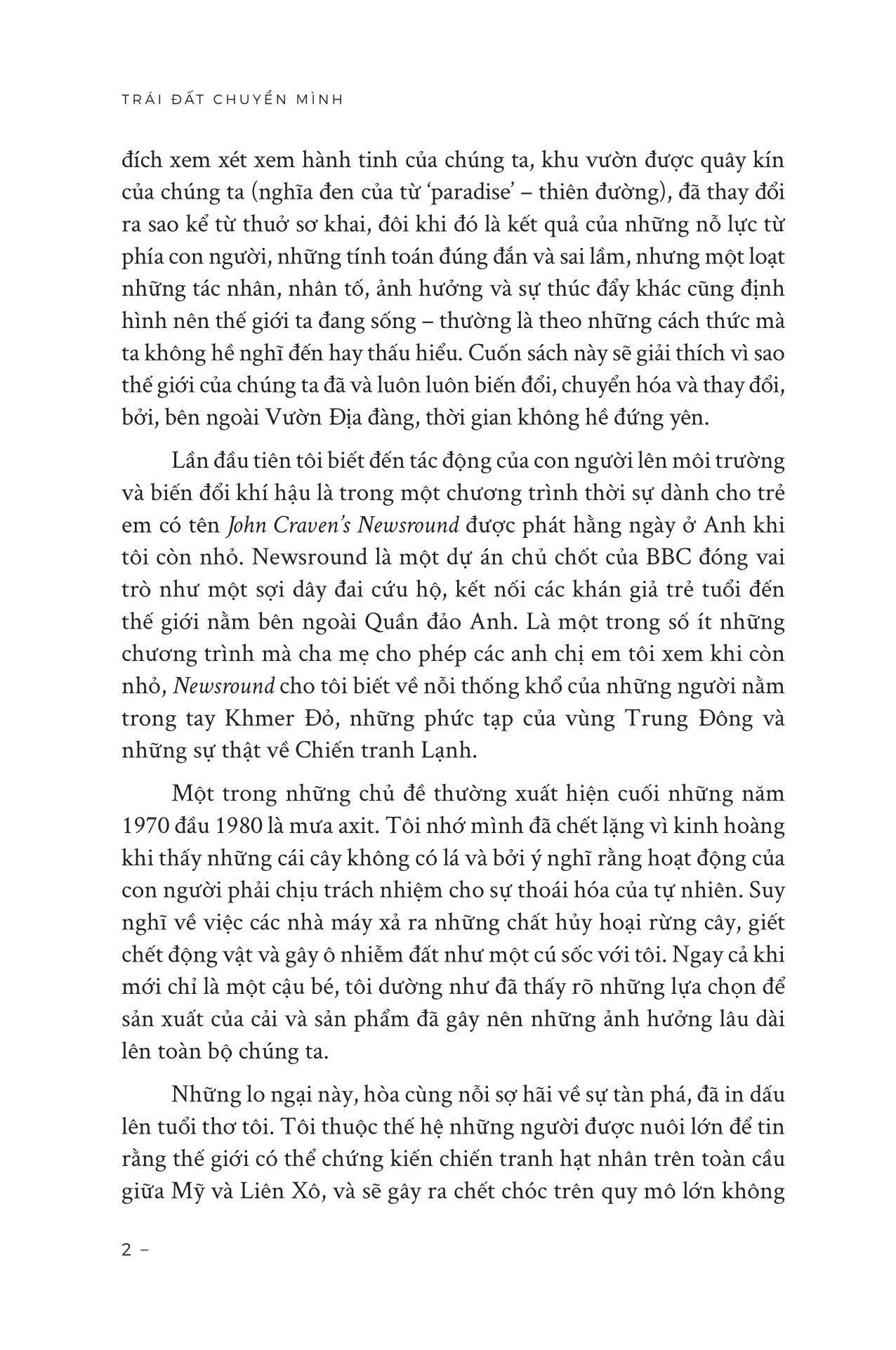 Khi nghĩ về lịch sử, chúng ta hiếm khi chú ý nhiều đến những trận lũ lụt kinh khủng nhất, những mùa đông tồi tệ nhất, những đợt hạn hán tàn khốc nhất hay cách các hệ sinh thái đã thay đổi theo thời gian. Trong “Trái đất chuyển mình”, GS Peter Frankopan đã chỉ ra rằng môi trường tự nhiên là một yếu tố quan trọng, nếu không muốn nói là yếu tố quyết định, trong lịch sử loài người và của cả lịch sử toàn cầu.