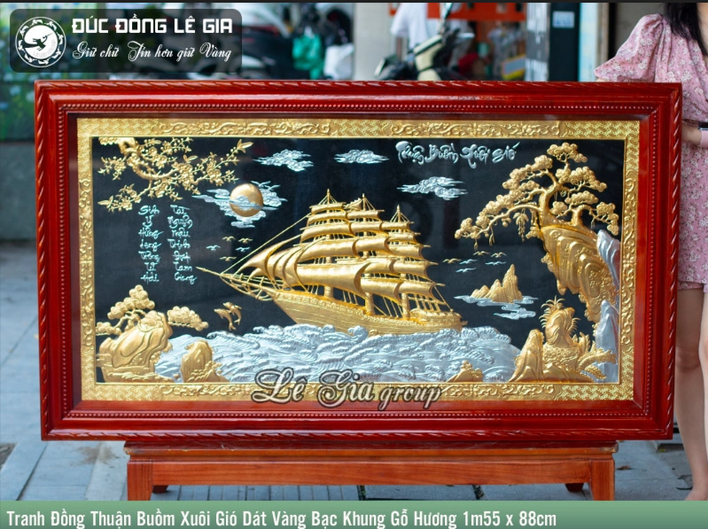 Mua tại TiktokTên sản phẩm: Tranh Đồng Thuận Buồm Xuôi Gió dát vàng bạc khung gỗ hương 1m55 x 88cm Chất liệu: Đồng vàng nguyên tấm dày 8 rem, khung gỗ hương Kích thước: 1m55 x 88cm Chất liệu bề mặt: Dát vàng bạc Phương thức: Chạm tay thủ công Mẫu: Chế tác theo yêu cầu