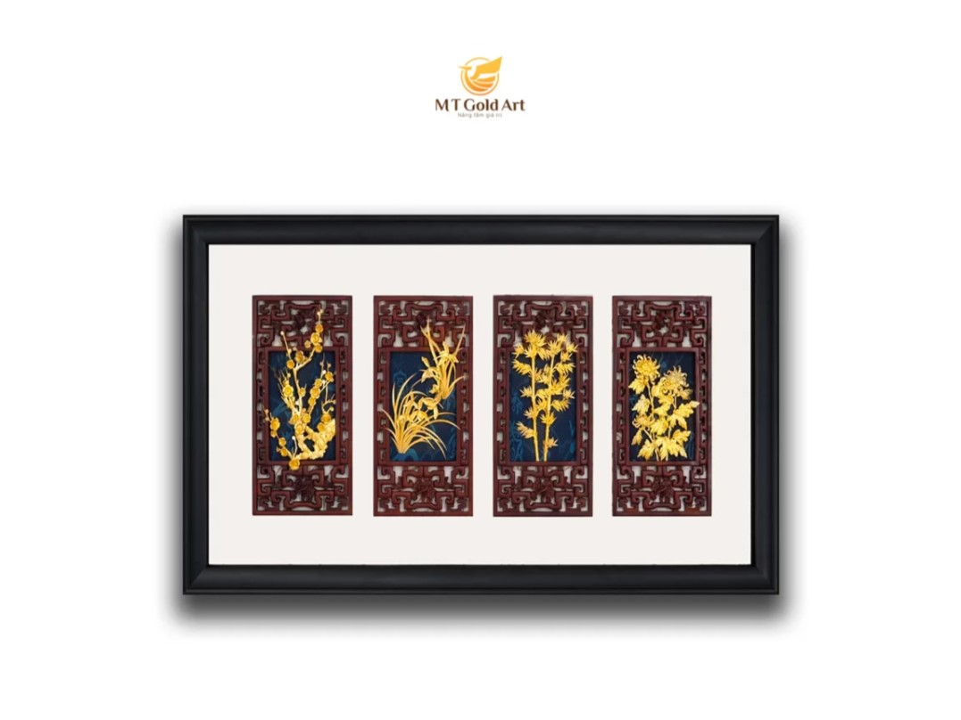 Tranh tứ quý dát vàng 24k nhập khẩu của thương hiệu MT Gold Art là một trong những sản phẩm được nhiều người ưa chuộng vì thiết kế kiểu dáng hài hòa, trang trọng, đẹp mắt đồng thời còn chứa đựng nhiều thông điệp có ý nghĩa tích cực.