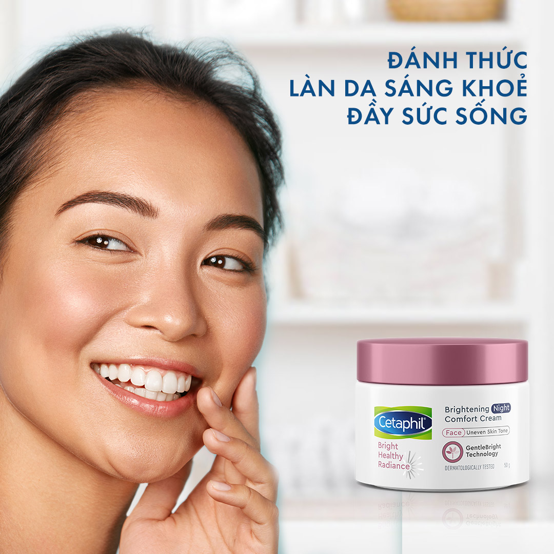 Hằng đêm, Kem dưỡng ẩm làm sáng da ban đêm cho da nhạy cảm Cetaphil Bright Healthy Radiance Brightening Night Comfort Cream sẽ hoạt động trên da giúp làm mờ các đốm nâu, giúp da tươi sáng và dưỡng ẩm cho da, để bạn thức dậy với làn da tươi tắn, sáng khoẻ rõ rệt vào mỗi buổi sáng. Kem dưỡng cũng giúp chống lại 5 dấu hiệu da nhạy cảm: da khô, kích ứng, không mịn màng, da căng và hàng rào bảo vệ da suy yếu.