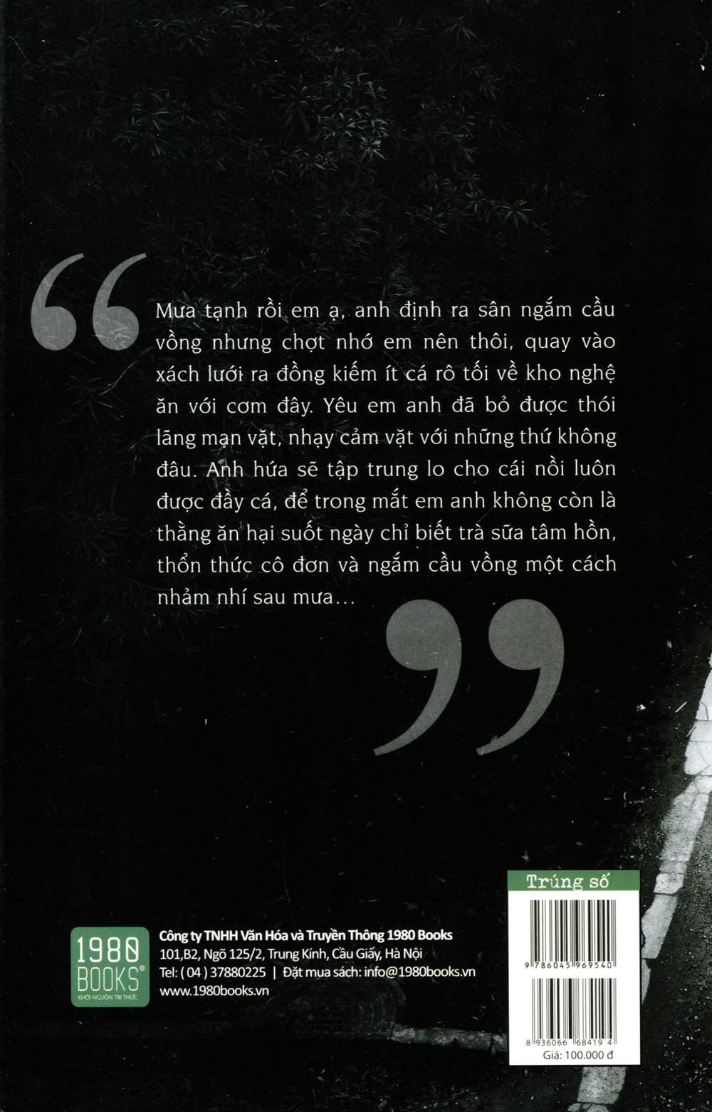 "Mưa tạnh rồi em ạ, anh định ra sân ngắm cầu vồng nhưng chợt nhớ em nên thôi, quay vào xách lưới ra đồng kiếm ít cá rô tối về kho nghệ ăn với cơm đây. Yêu em anh đã bỏ được thói lãng mạn vặt, nhạy cảm vặt với những thứ không đâu. Anh hứa sẽ tập trung lo cho cái nồi luôn được đầy cá, để trong mắt em anh không còn là thằng ăn hại suốt ngày chỉ biết trà sữa tâm hồn, thổn thức cô đơn và ngắm cầu vồng một cách nhảm nhí sau mưa…"