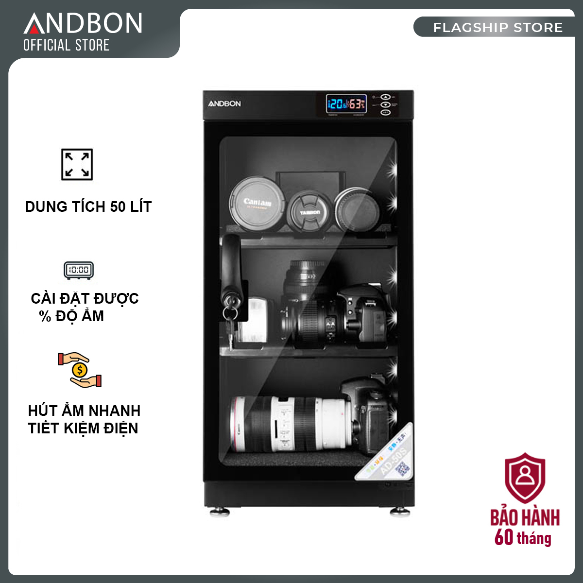 TỦ CHỐNG ẨM ANDBON AD-50S - HÀNG NHÂP KHẨU CHÍNH HÃNG BẢO HÀNH 5 NĂM TOÀN QUỐC THEO TEM ĐIỆN TỬ<< DUNG TÍCH 50 LÍT - 3 NGĂN - MÀN HÌNH LCD >> [ CÓ THỂ CÀI ĐẶT ĐƯỢC % ĐỘ ẨM ] Có m...