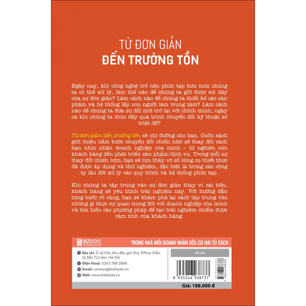 Cuốn sách “Từ đơn giản đến trường tồn” là cuốn cẩm nang dành cho những con người muốn đổi mới, doanh nghiệp muốn đổi mới để dẫn dắt công ty của mình bước lên tầm cao mới. Cuốn sách giới thiệu năm bước chuyển đổi chiến lược phát triển, sẽ giúp bạn nhìn nhận lại doanh nghiệp của mình từ nghiên cứu khách hàng đến phát triển sản phẩm dịch vụ. Trong mỗi sự thay đổi chiến lược, bạn sẽ tìm ra những công cụ thiết thực đã được áp dụng và thử nghiệm.