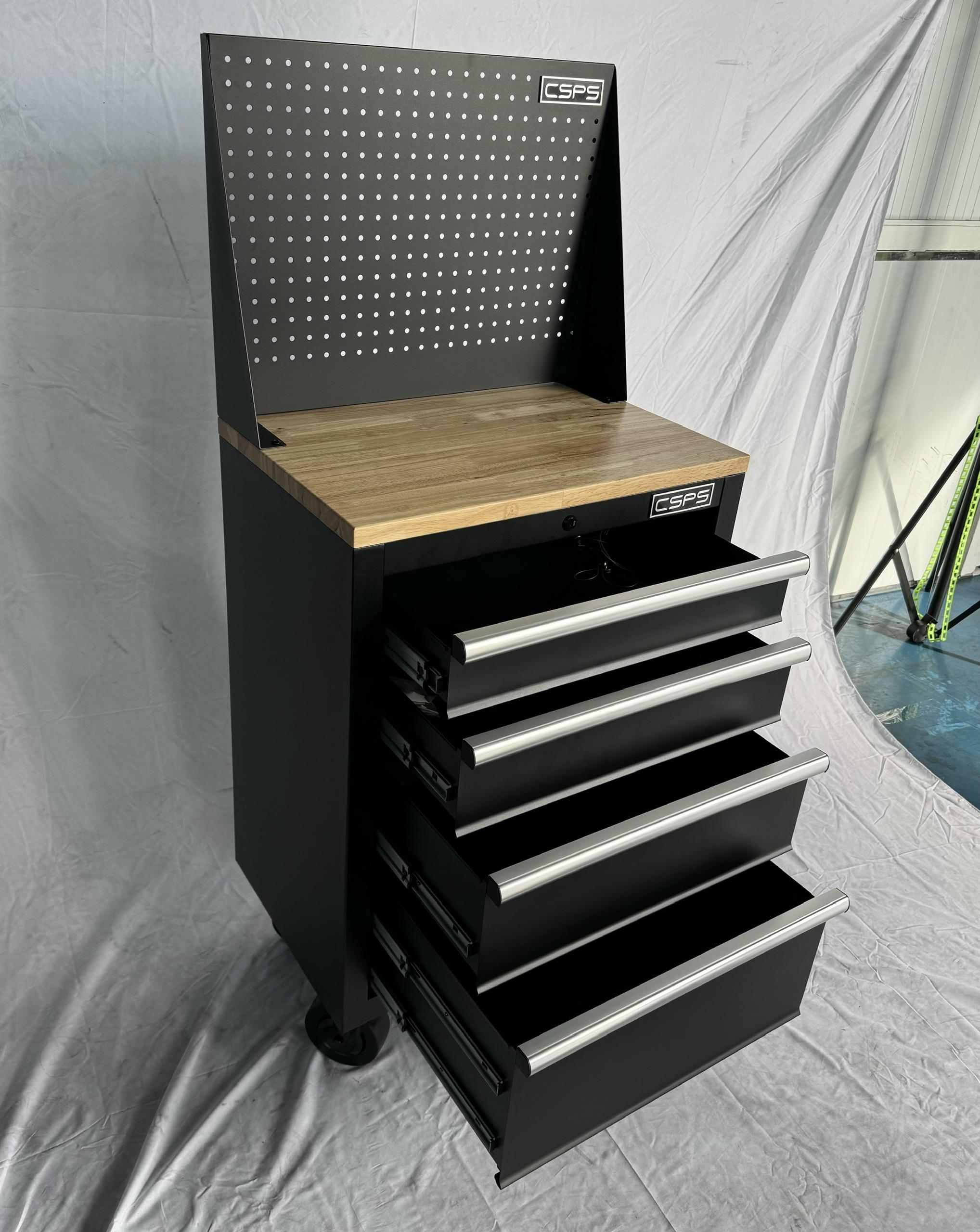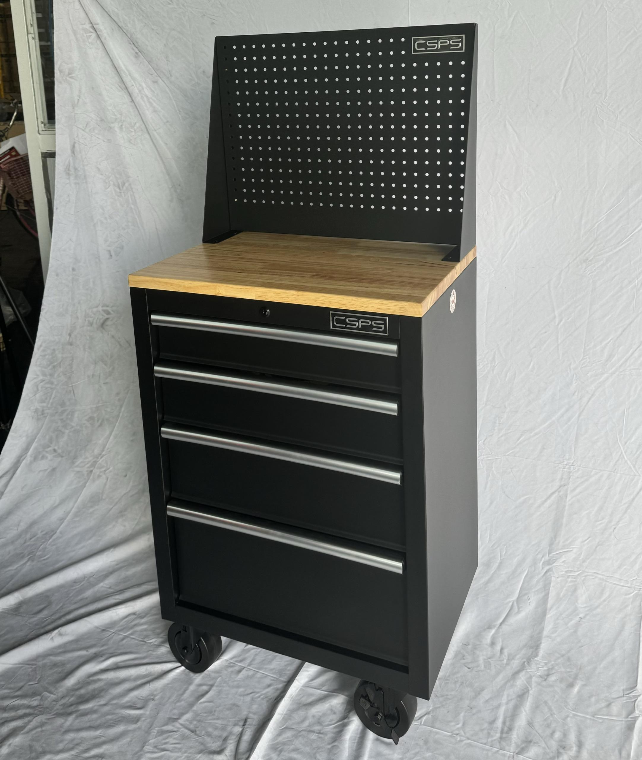 Tủ dụng cụ CSPS 61cm - 04 hộc kéo màu đen bánh xe ván gỗ vách lưới (tay cầm trắng)