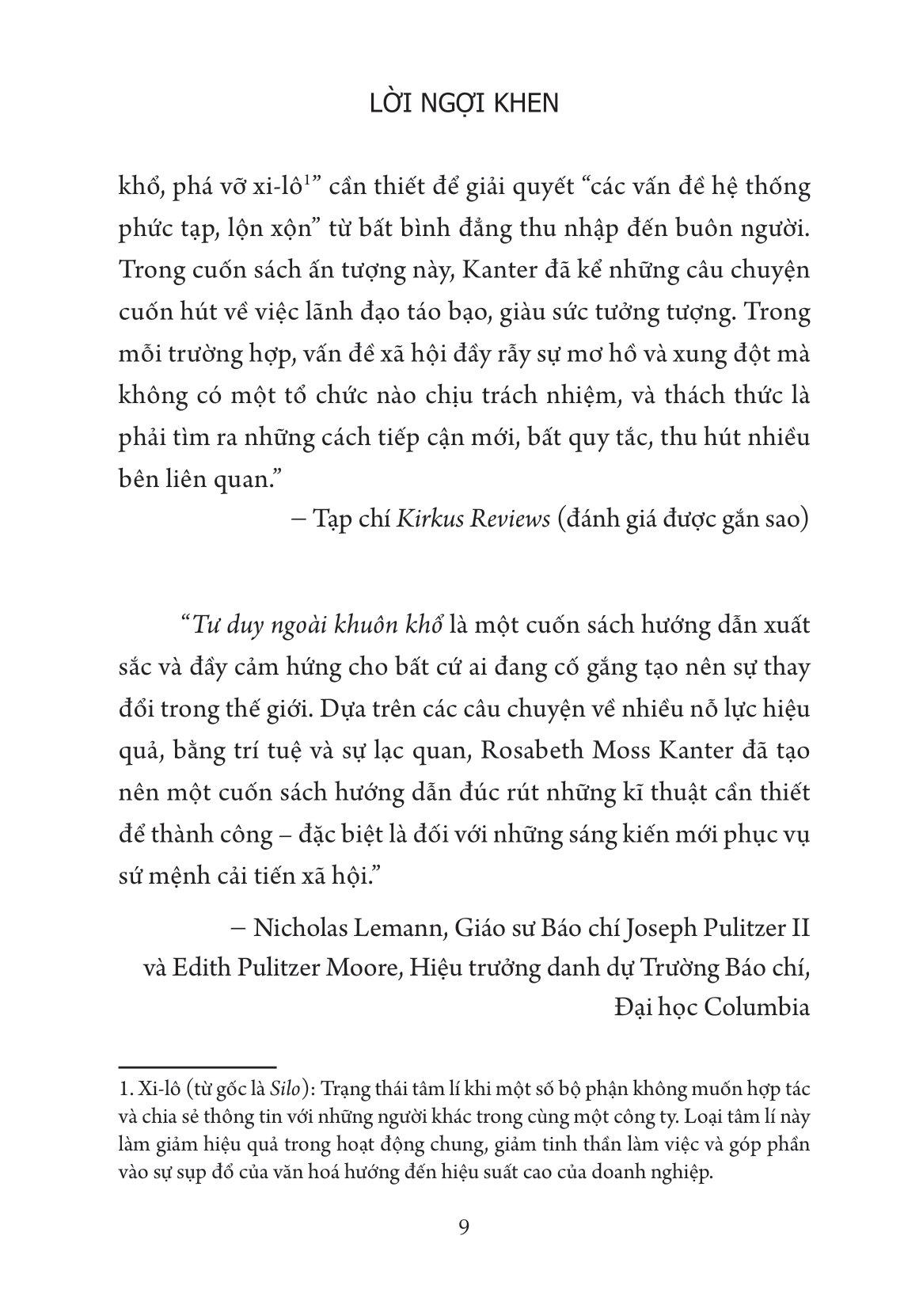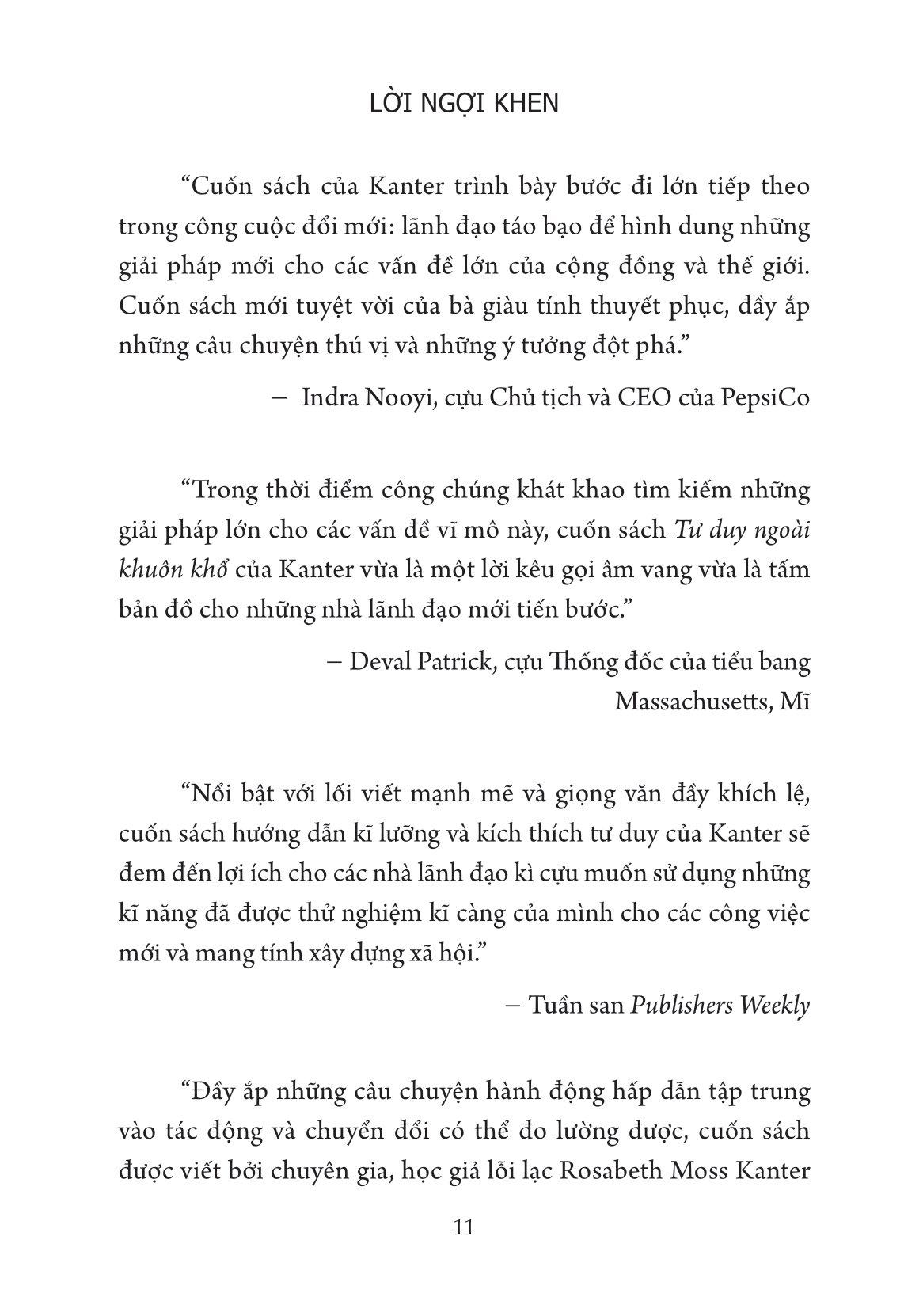 “[Rosabeth Moss Kanter đã minh họa] cách các nhà lãnh đạo giàu kinh nghiệm trong lĩnh vực kinh doanh và các ngành nghề khác có thể hành động theo “chủ nghĩa lí tưởng tuổi trẻ” của m.ình và tạo nên sự khác biệt khi giải quyết các vấn đề xã hội phức tạ [bằng việc thu được] các kĩ năng “vượt ngoài khuôn khổ, phá vỡ xi-lô1” cần thiết để giải quyết “các vấn đề hệ thống phức tạp, lộn xộn” từ bất bình đẳng thu nhập đến buôn người. Trong cuốn sách ấn tượng này, Kanter đã kể những câu chuyện cuốn hút về việc lãnh đạo táo bạo, giàu sức tưởng tượng. Trong mỗi trường hợp, vấn đề xã hội đầy rẫy sự mơ hồ và xung đột mà không có một tổ chức nào chịu trách nhiệm, và thách thức là phải tìm ra những cách tiếp cận mới, bất quy tắc, thu hút nhiều bên liên quan.” − Tạp chí Kirkus Reviews (đánh giá được gắn sao)