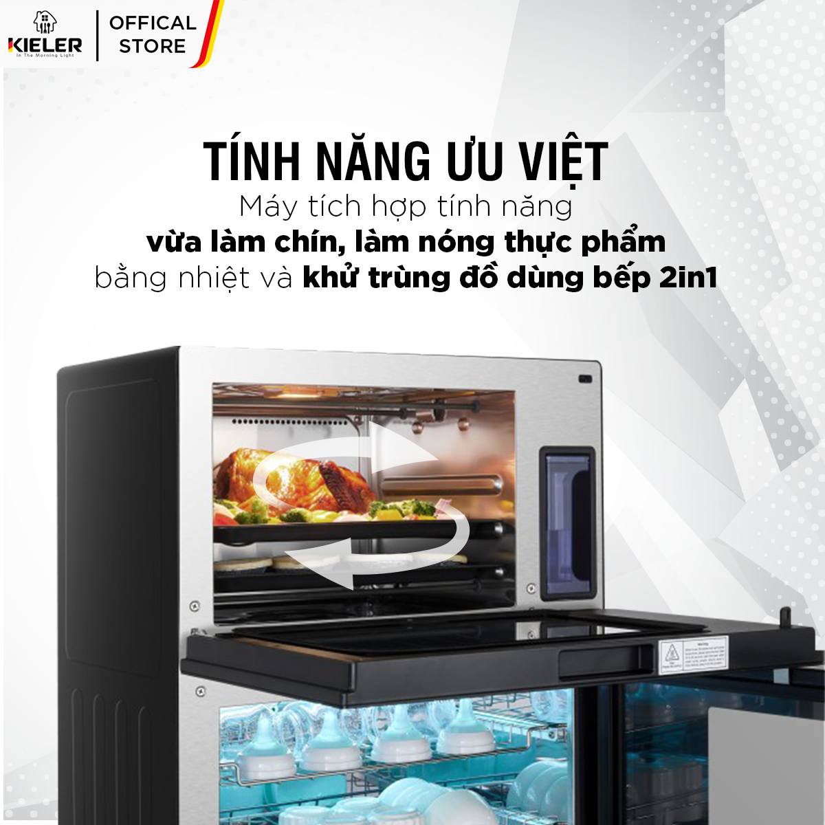 - Tủ khử trùng Kieler KL-TL520 2 in 1 là giải pháp đa năng cho việc làm chín và làm nóng thực phẩm bằng hơi nước và khử trùng đồ dùng bếp.