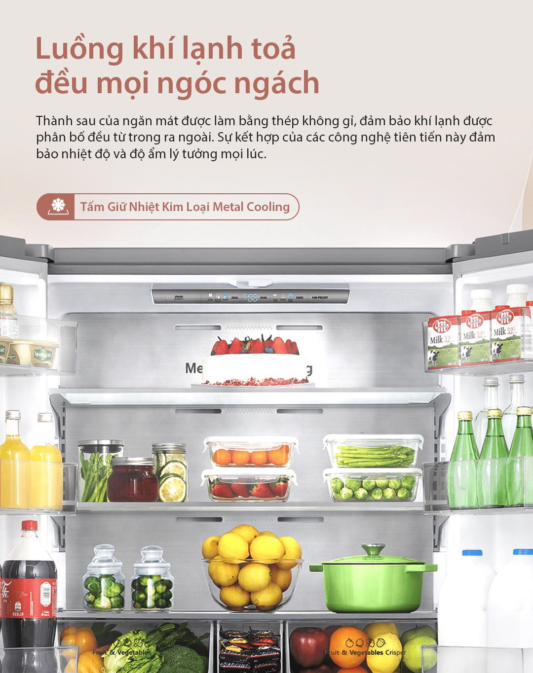 - Tấm Giữ Nhiệt Kim Loại Metal Cooling: Thành sau của ngăn mát được làm bằng thép không gỉ, đảm bảo khí lạnh được phân bố đều từ trong ra ngoài. Sự kết hợp của các công nghệ tiên tiến này đảm bảo nhiệt độ và độ ẩm lý tưởng mọi lúc.