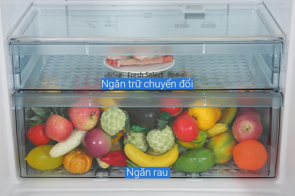- Ngăn trữ thịt cá và rau quả tươi: Cho phép tùy chỉnh 2 mức nhiệt để trữ rau quả hoặc trữ sữa/thịt, giữ lạnh tốt, cho thực phẩm và thức ăn tươi ngon lâu hơn mà không bị đông đá.