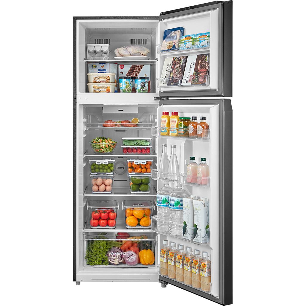 Tổng quan thiết kế - Tủ lạnh Hitachi với thiết kế kiểu dáng ngăn đá trên, tone màu đen dễ dàng kết hợp với nội thất trong nhà. - Cửa tủ lạnh được làm bằng chất liệu thép không