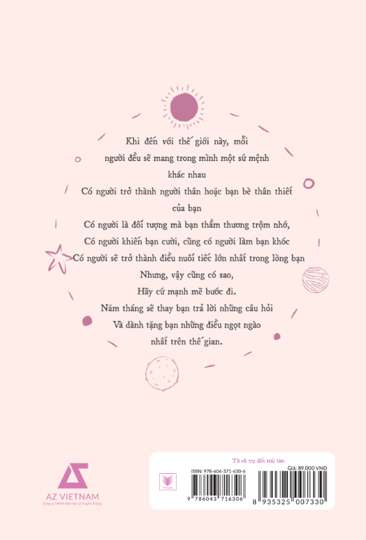 Mua tại TiktokTừ Vũ Trụ Đến Trái Tim - Những Thông Điệp Yêu Thương Khi đến với thế giới này, mỗi người đều sẽ mang trong mình một sứ mệnh khác nhau. Có người trở thành người thân hoặc bạn bè thân thiết của bạn; Có người lại là đối thượng mà bạn thầm thương; Có người khiến bạn cười, cũng có người khiến bạn khóc; Có người trở thành điều tuối tiếc lớn nhất trong lòng bạn… Nhưng, như vậy cũng có sao. Hãy tiếp tục mạnh mẽ mà bước đi. Năm tháng sẽ thay bạn trả lời cho những câu hỏi, và Vũ trụ sẽ mang đến cho bạn những điều ngọt ngào nhất thế gian.