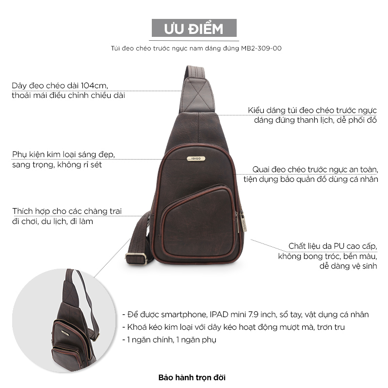 Với phom túi đứng cùng dáng túi đa dạng, thiết kế nhiều ngăn chủ yếu là ngăn ngoài mặt trước có khoá kéo ở miệng túi mang lại sự tiện lợi và an toàn cho người dùng có quai đeo dài, gọn nhẹ lại rất hữu dụng với ngăn chứa rộng rãi ắt hẳn sẽ khiến cho các tín đồ yêu thời trang muốn sở hữu ngay lần gặp đầu tiên. Thấu hiểu được tâm tư của các chàng, IDIGO cho ra mắt sản phẩm Túi đeo chéo trước ngực nam dáng đứng IDIGO MB2-309-00.